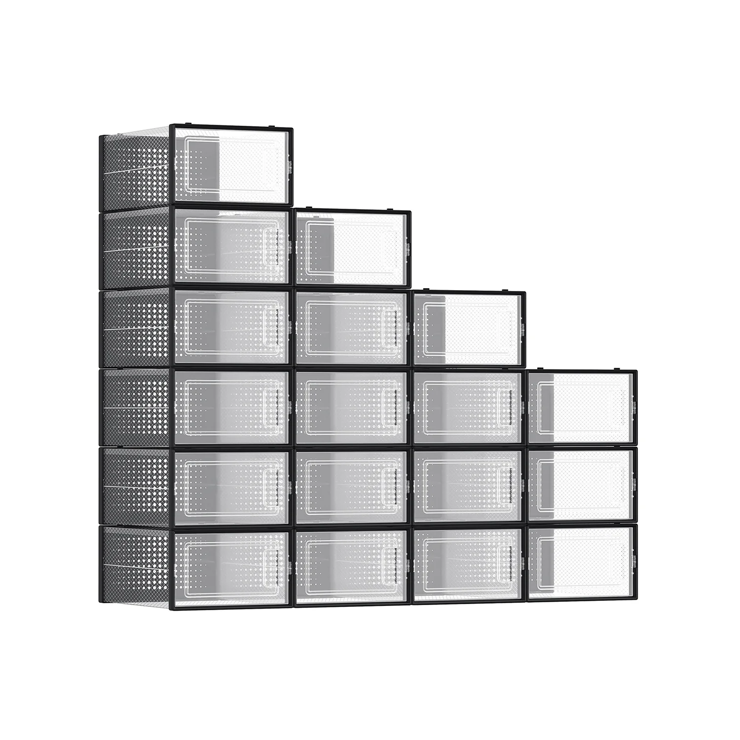 SONGMICS Cajas de Zapatos Plástico, Juego de 18 Organizadores de Almacenamiento, Caja Zapatero Plástico Plegable y Apilable para Zapatillas hasta Talla 46, Transparente y Negro LSP007B18