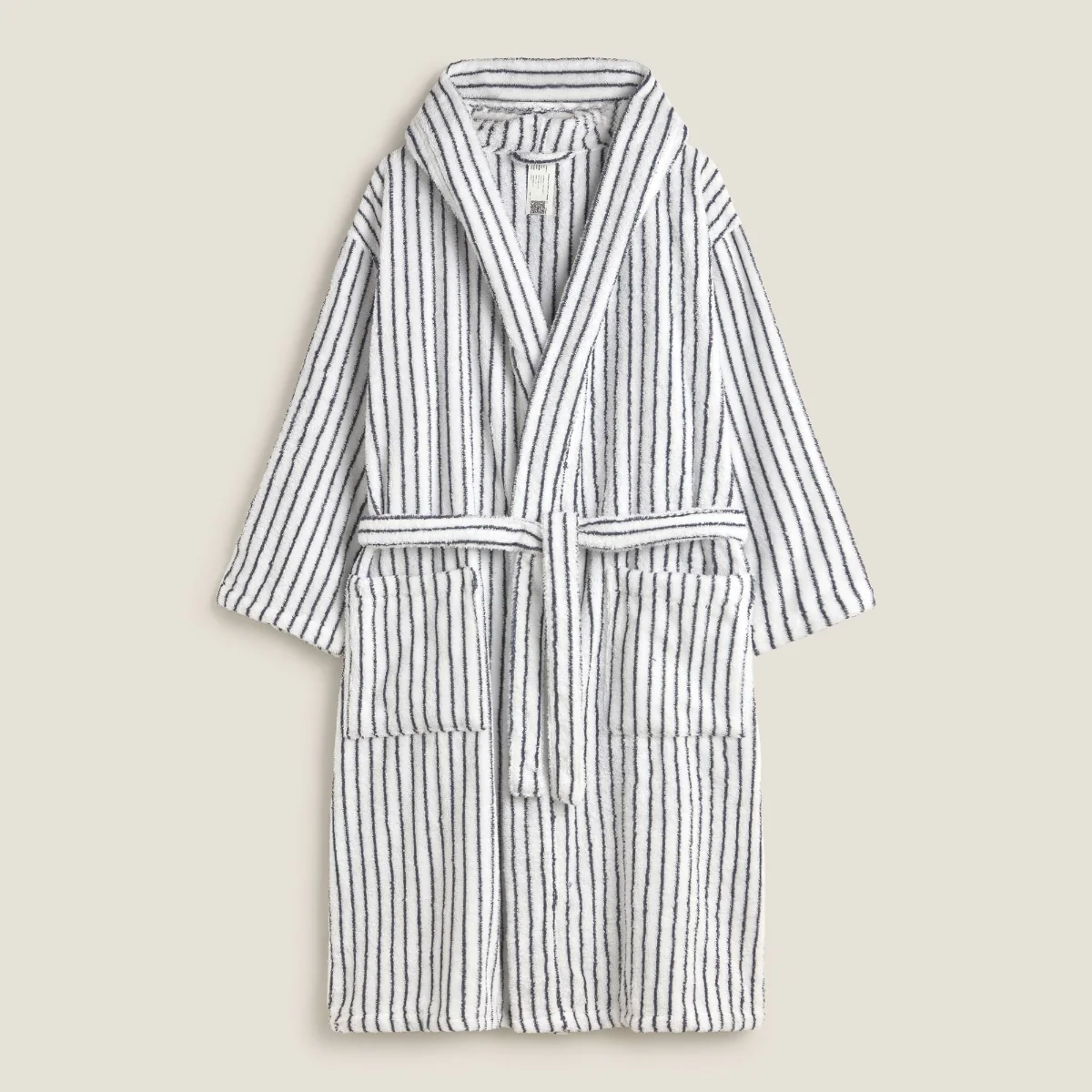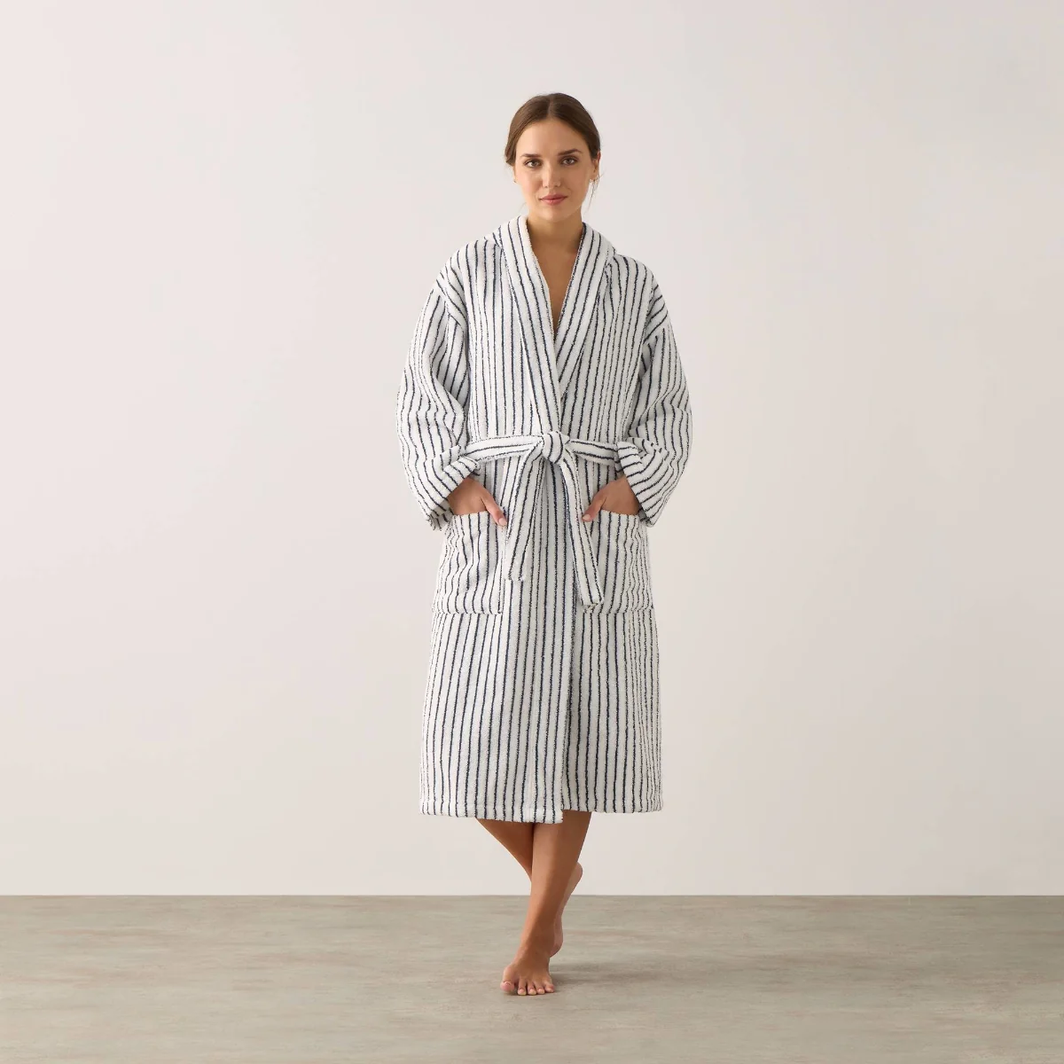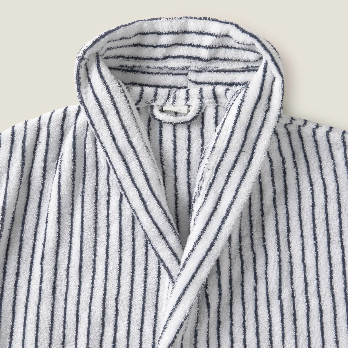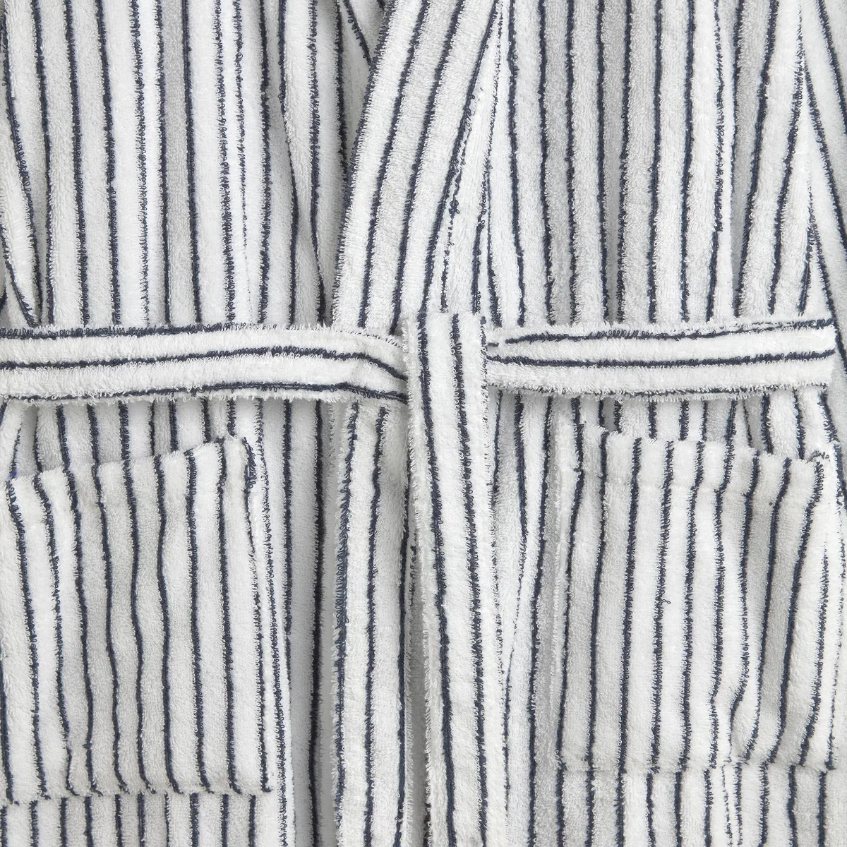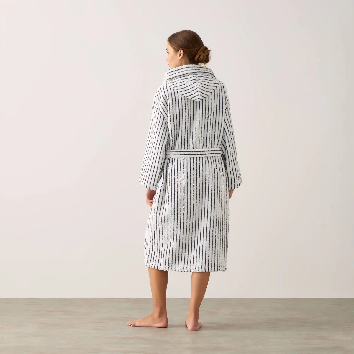 Albornoz unisex de rizo de algodón de 400 g, suave y muy absorbente. Diseño a rayas verticales en blanco y azul marino, con capucha, cinturón extraíble y prácticos bolsillos. Confeccionado en Portugal.