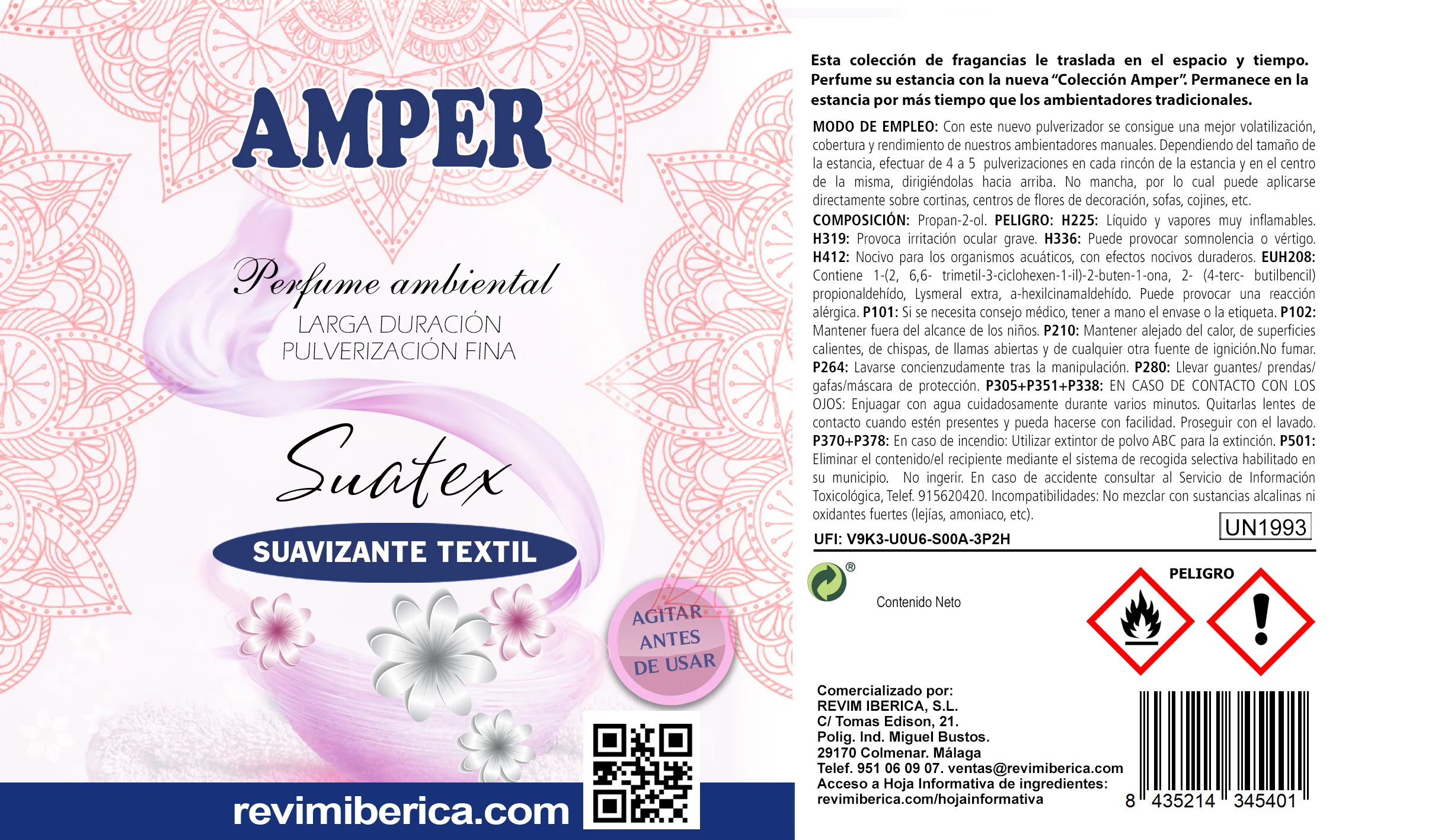 🌸 El Ambientador SUATEX de AMPER perfuma el ambiente con una fragancia suave, fresca y duradera que recuerda al clásico olor a ropa limpia recién lavada. Su fórmula profesional, elaborada en nuestra fábrica con los más altos estándares de calidad, no solo ambienta sino que ayuda a eliminar arrugas en tejidos al aplicarlo directamente sobre la ropa.