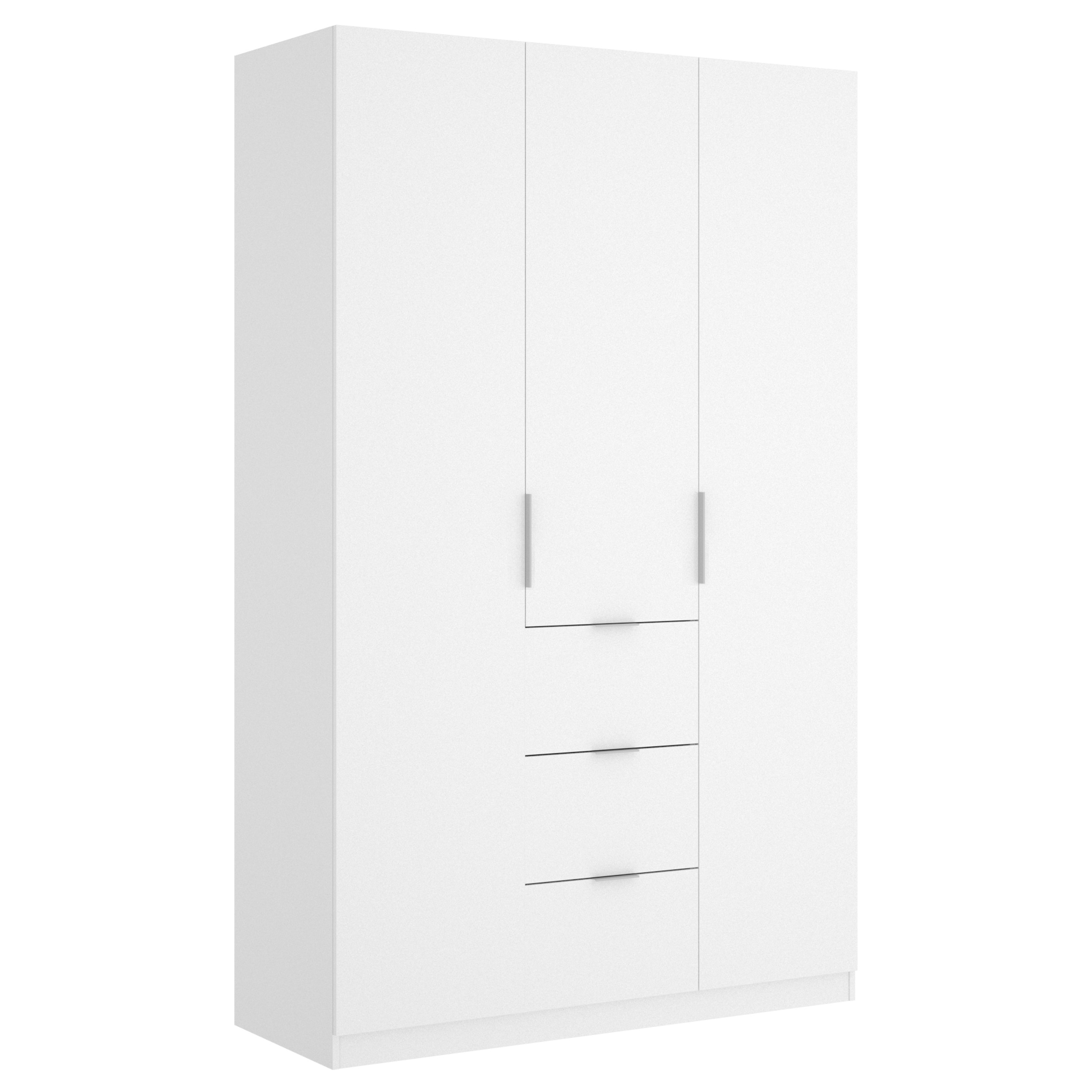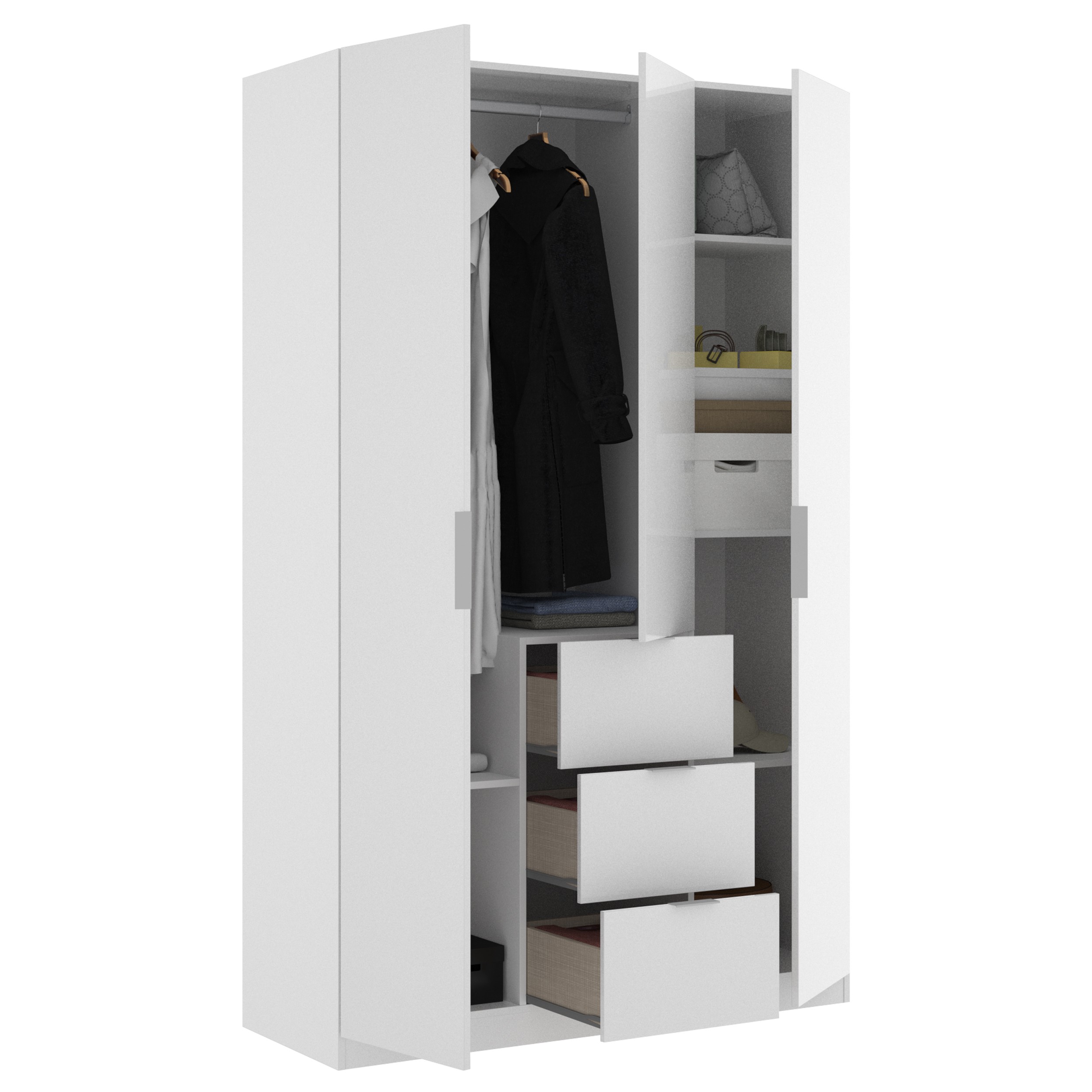 Armario de 3 puertas abatibles y 3 cajones grandes exteriores. Incluye una barra para colgar y cuatro estantes pequeños.