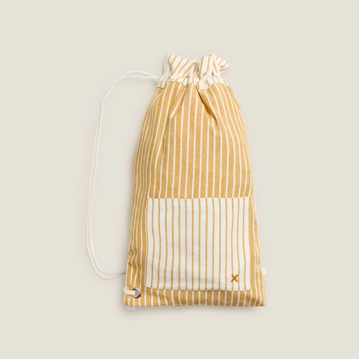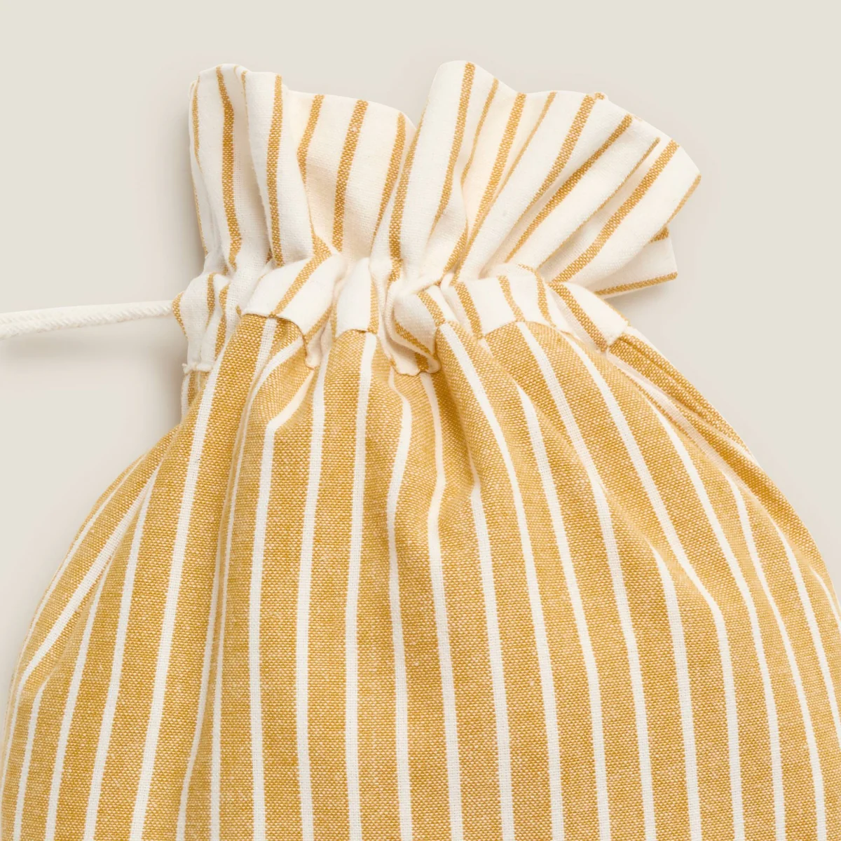 Bolsa de pan de algodón 100% a rayas tejidas. Con bolsillo de tejido a contraste. Se cierra con cordón de algodón ajustable.