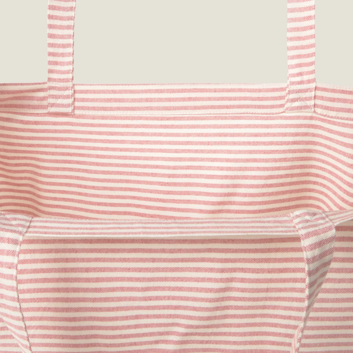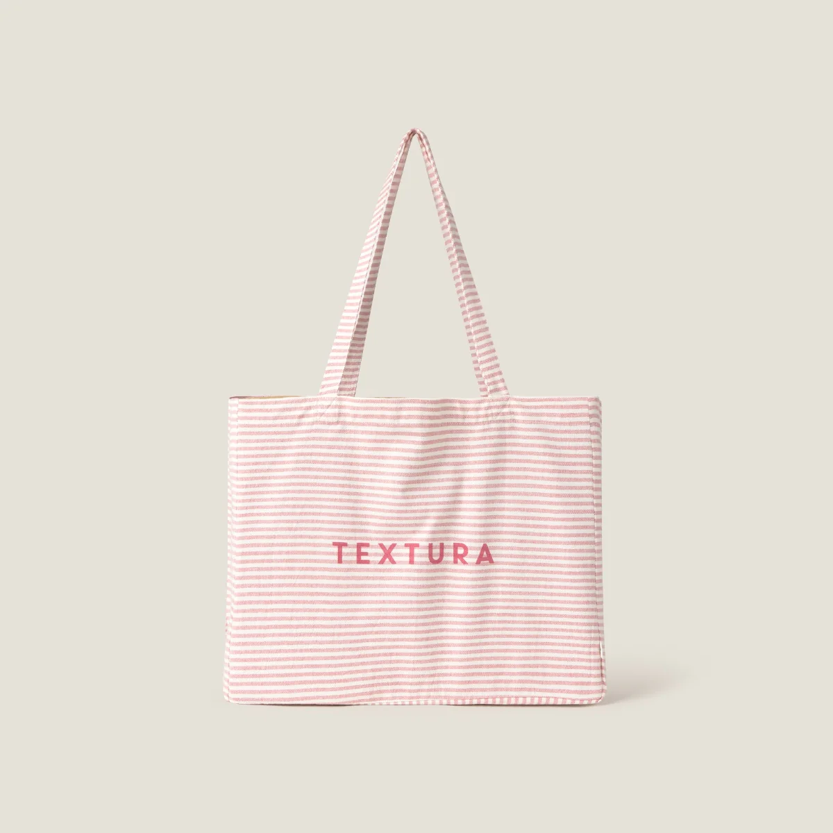 Bolsa de rayas en blanco y rosa con asas largas y logo de Textura en color rosa. Confeccionada en 100% algodón. Del 1 al 31 de octubre, el 100% de los beneficios se destina a la AECC para impulsar la investigación oncológica y apoyar a pacientes y familias.