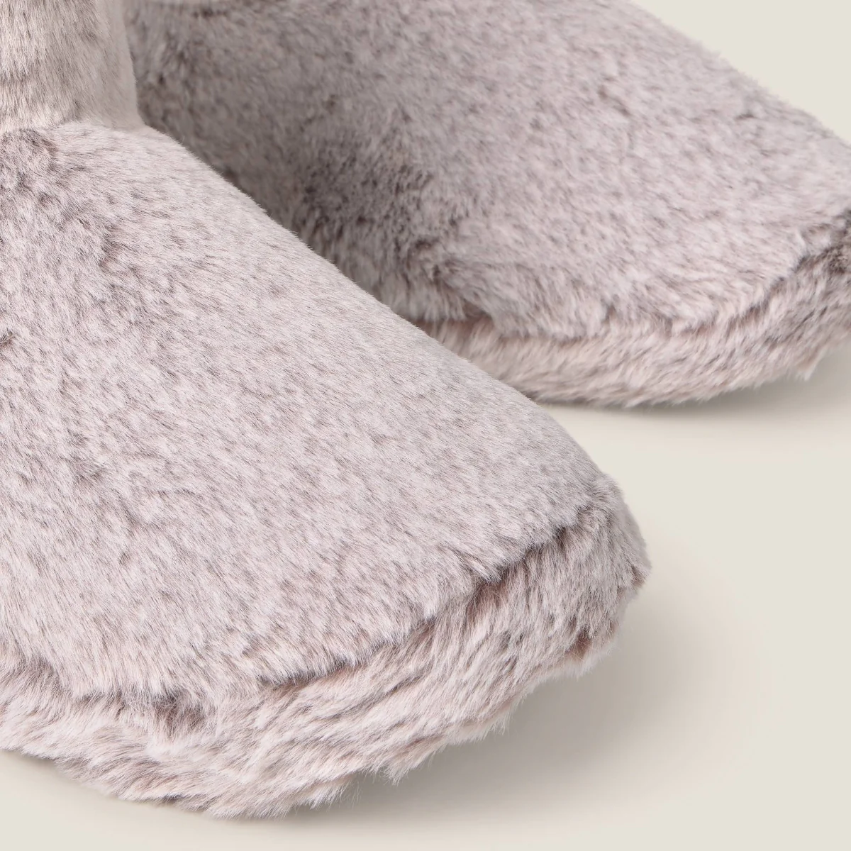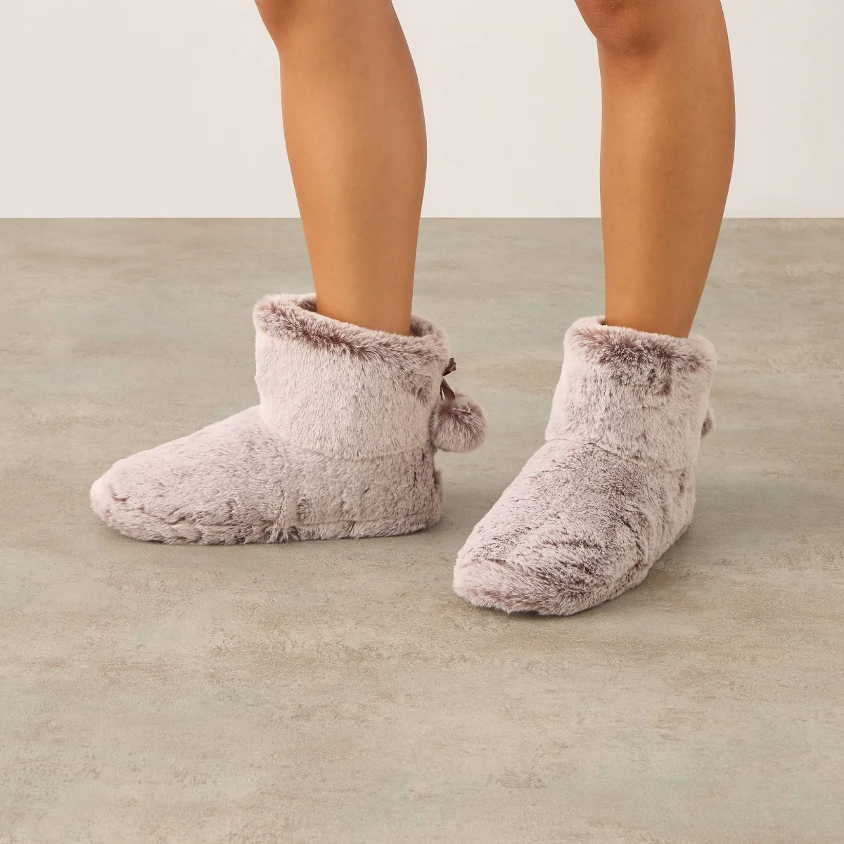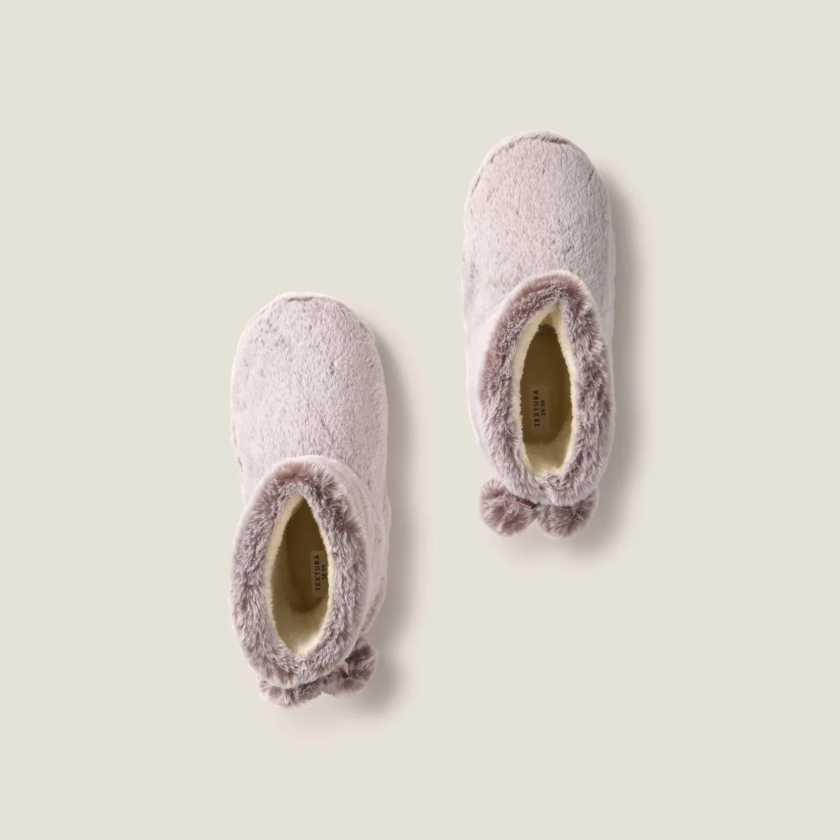 Bota tipo zapatilla con exterior e interior efecto pelo muy suave. Diseño envolvente en tono marrón, con borlas decorativas en la parte trasera. Cálidas y cómodas para el hogar. Disponibles en varias tallas.