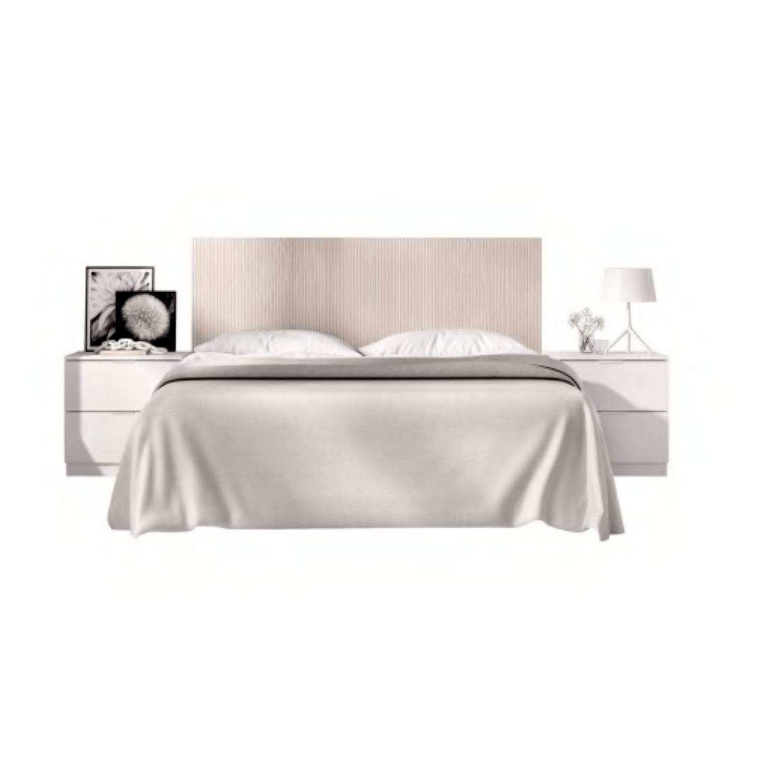 Cabecero alistonado para cama de matrimonio de 140 cm con dos mesitas de dos cajones cada una en color blanco.