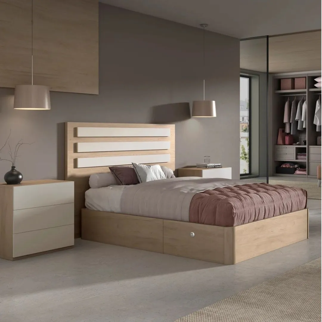 El cabecero de madera moderno junto al canape con cajones laterales en color roble/cambrian