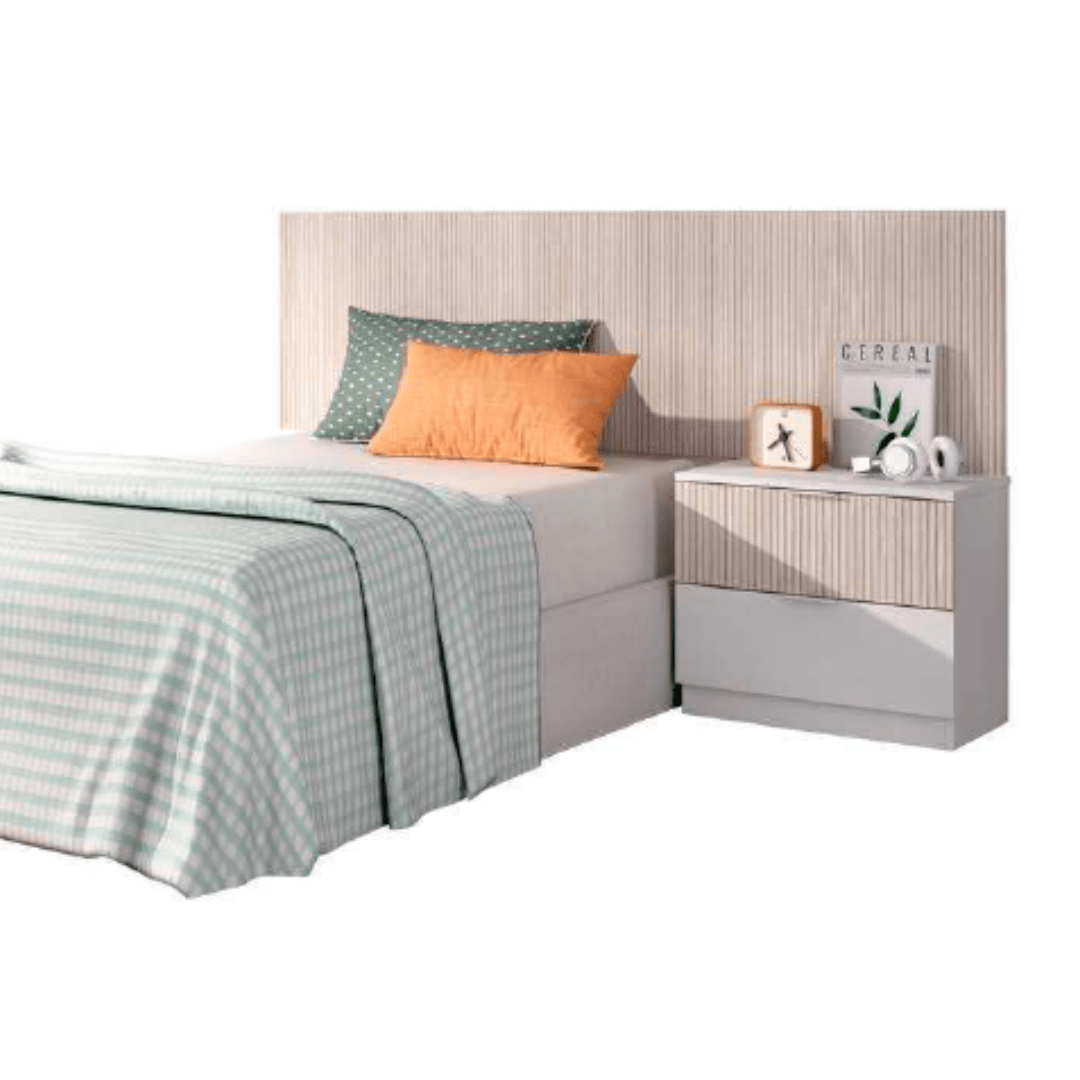 Cabezal alistonado con mesita de noche integrada con dos cajones, uno alistonado y otro blanco.