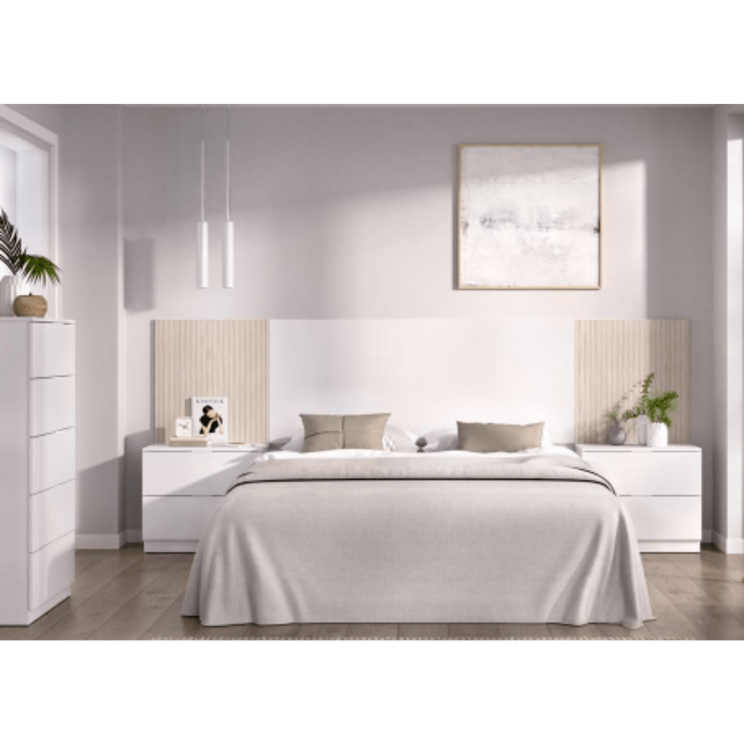 Cabecero alistonado/blanco para cama de 140 cm y dos mesitas de noche blancas con 2 cajones.