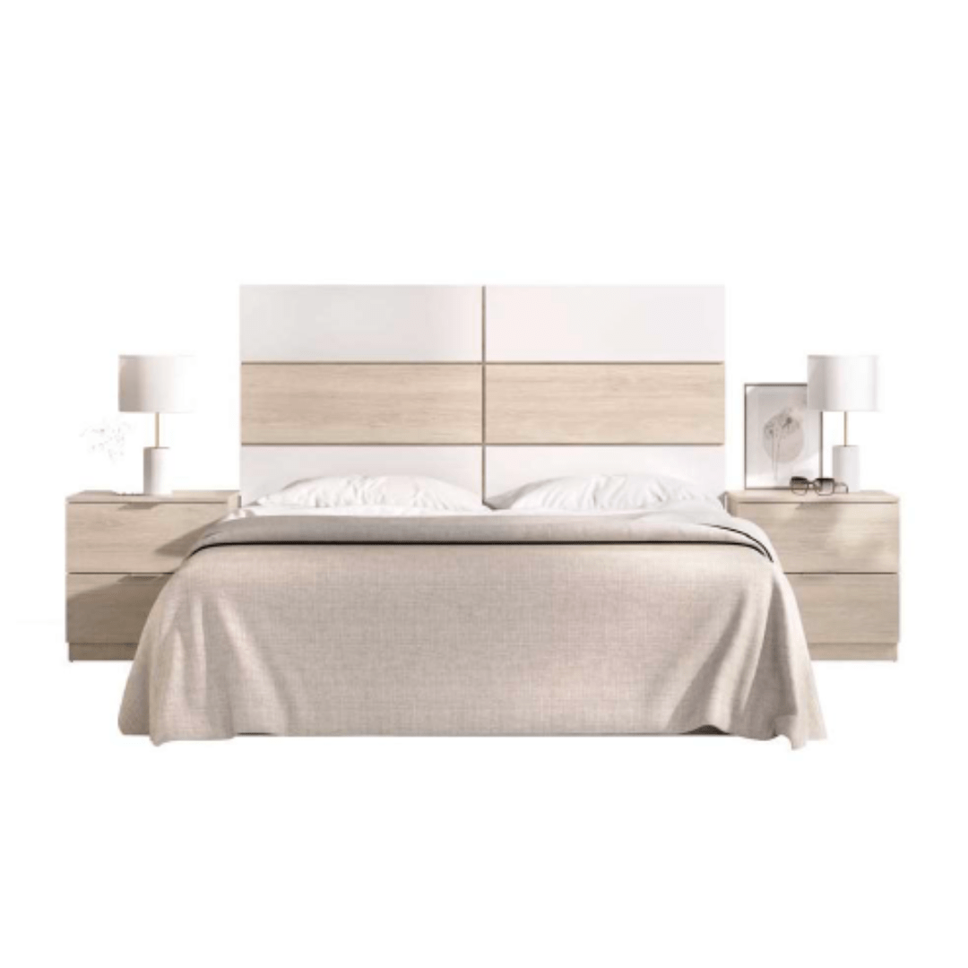 Conjunto de cabecero natural/blanco para cama de 140 cm con dos mesitas de dos cajones cada una en color natural.
