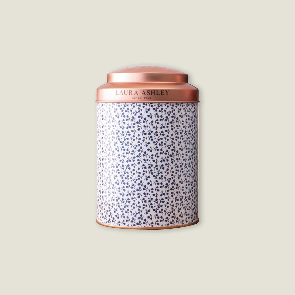 Caja de conservación de metal con diseño de flores azules y tapa hermética en tono cobre. Ideal para almacenar té, café o arroz, manteniendo los alimentos frescos por más tiempo. Medidas: Diámetro 12 cm, alto 18 cm.