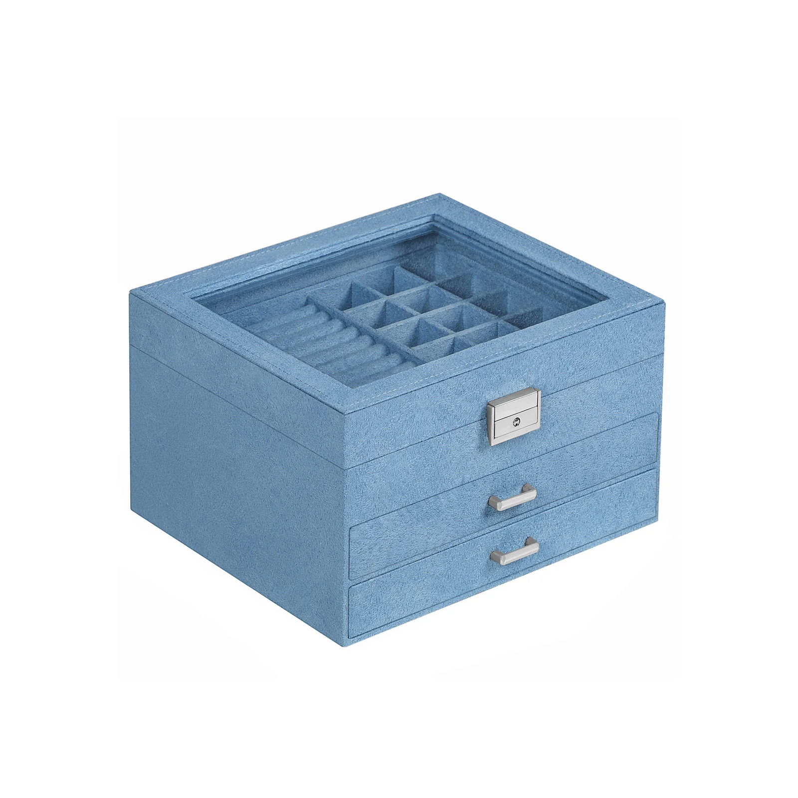 SONGMICS Caja de Joyas, Joyero de Terciopelo de 3 Pisos, con Tapa de Vidrio Transparente, Compartimentos Variables para Collares, Pulseras, Anillos, Cerraduras y Llaves, Negro JBC158B01