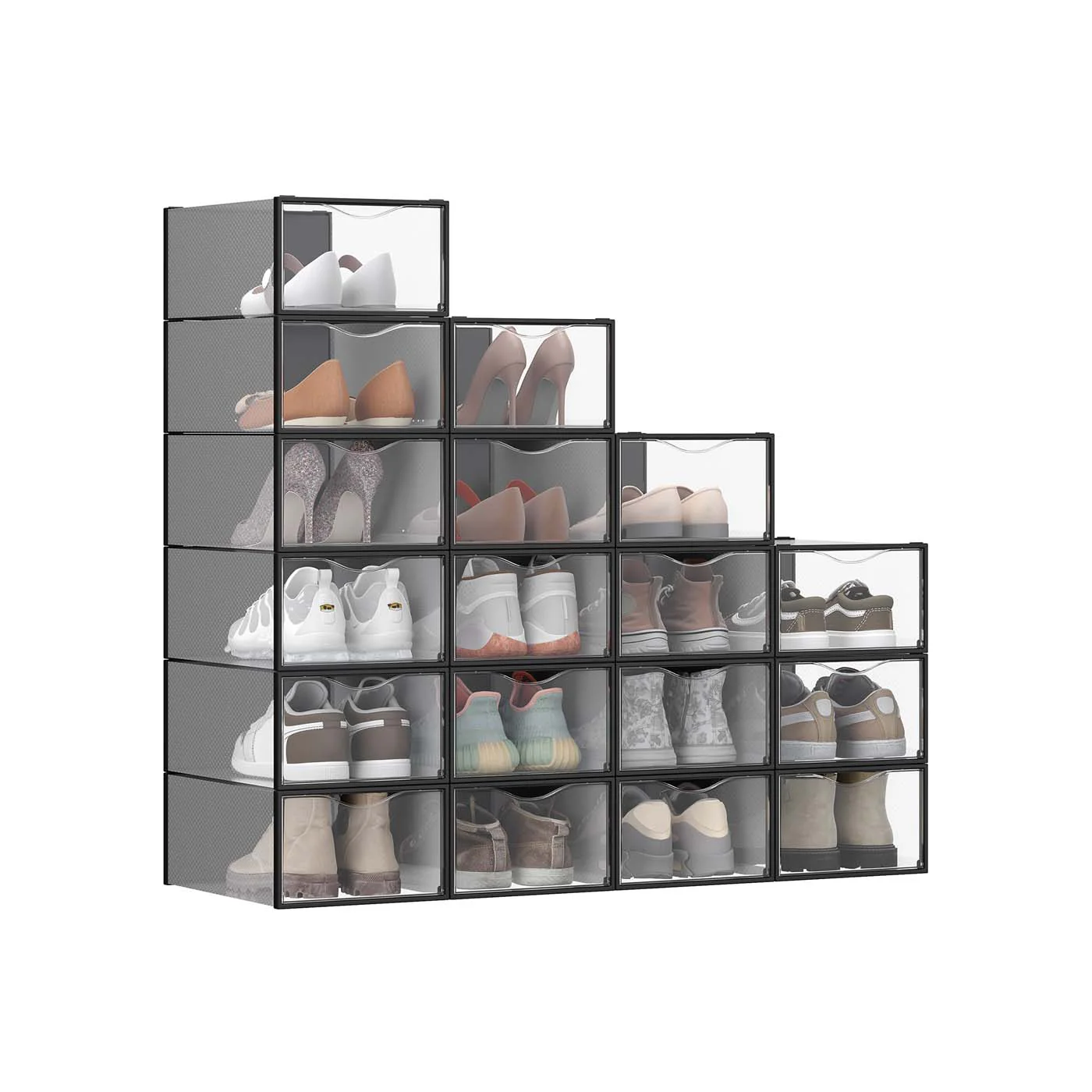 SONGMICS Cajas para Zapatos, Organizador de Zapatos de Plástico, con Puerta, Transparente, Juego de 12, Apilable, 33,2 x 23 x 14,5 cm, para Zapatos hasta 43, Transparente y Blanco Nube LSP312W01