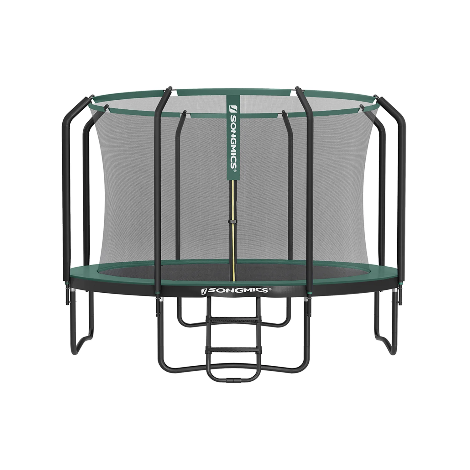SONGMICS Cama Elástica de 366 cm, Redonda Cama Elástica de Jardín con Red de Seguridad Interior, Escalera, Postes Acolchados, para Niños y Adultos, Negro y Verde Oscuro STR123C01