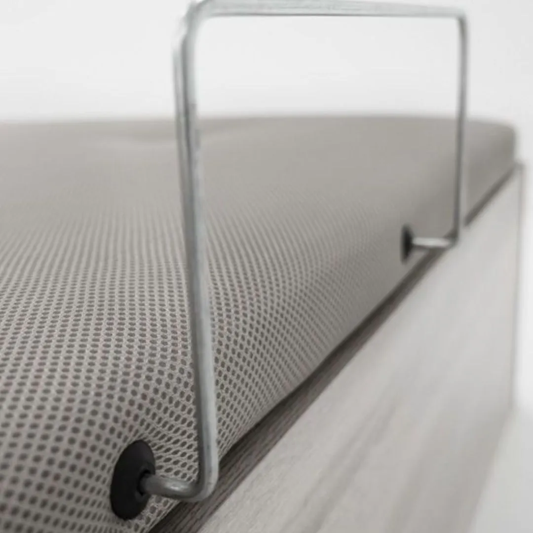 La base del canapé Áurea está formada por una estructura metálica junto a un tablero de madera que otorga un soporte fuerte y muy resistente. Esta base cuenta con un tapizado en tejido 3D a juego con el color del cajón elegido y destaca por ser transpirable y antideslizante. A su vez, incorpora 4 canales de ventilación y un retenedor metálico evita movimientos.