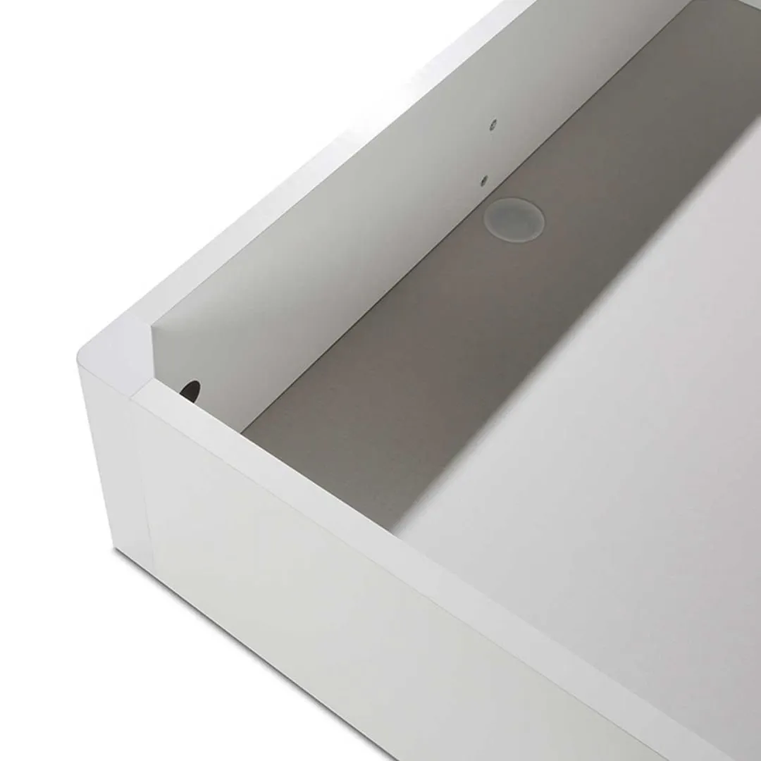 Bajo la cama, el canapé de madera en ángulo recto y con apertura lateral presenta un nuevo espacio de almacenamiento extra. Deja de lado el antiguo hueco ocupado por las cajas de zapatos y repleto de polvo con un armario de 28cm de capacidad útil reforzado en el suelo con tableros de 10mm de grosor que impiden el trasvase y la aparición de polvo en el interior. Un espacio que se consigue a través del resistente armazón de 30mm de grosor que conforma al cajón del canapé en ángulo recto y da un total de 36cm de altura en su estructura al completo entre cajón y tapa.