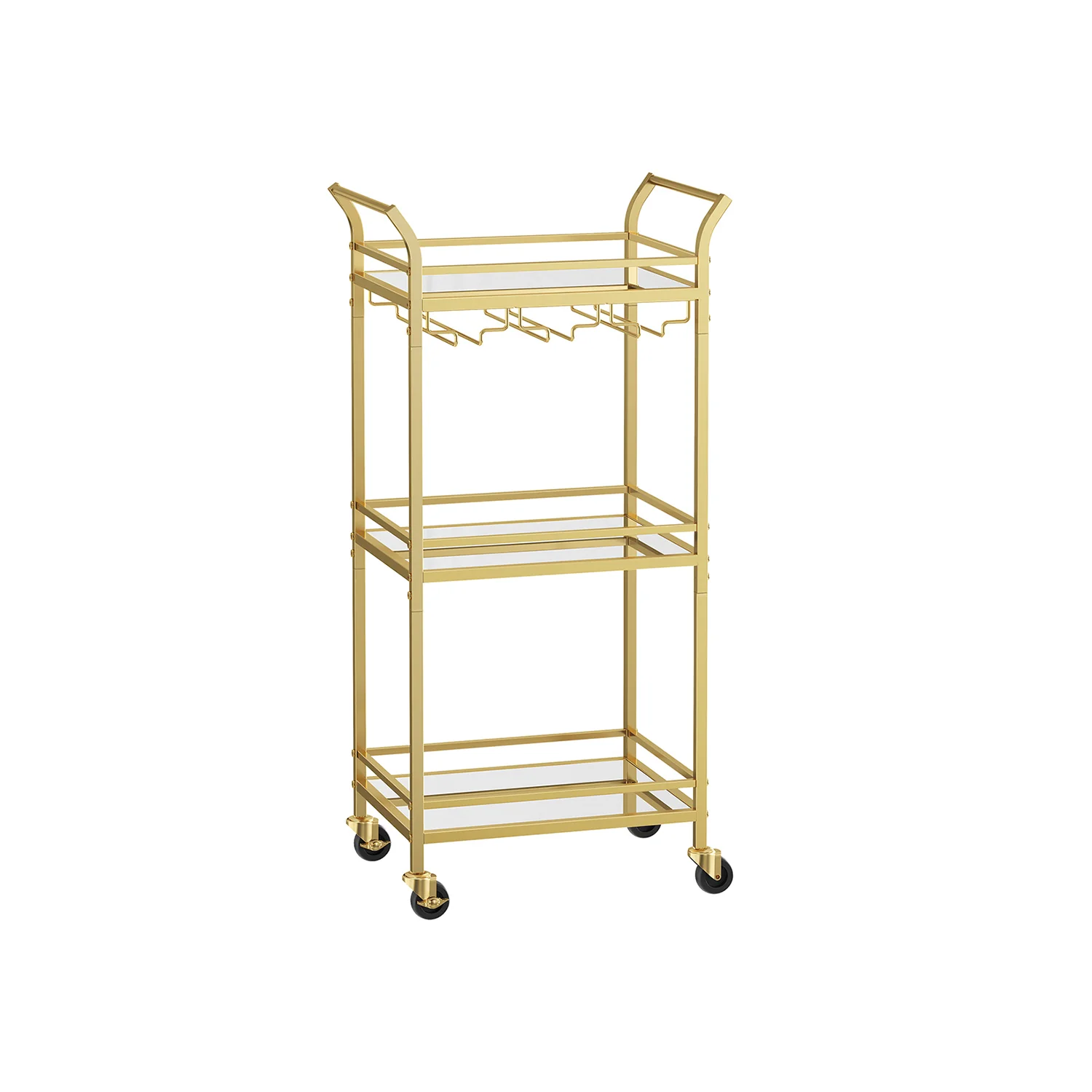 VASAGLE Carrito de 3 Niveles, Carro de Cocina Dorado, con Ruedas, con Pasamanos, Vidrio de Espejo, Carro para Espacios Pequeños, Cocina, Comedor, Baño