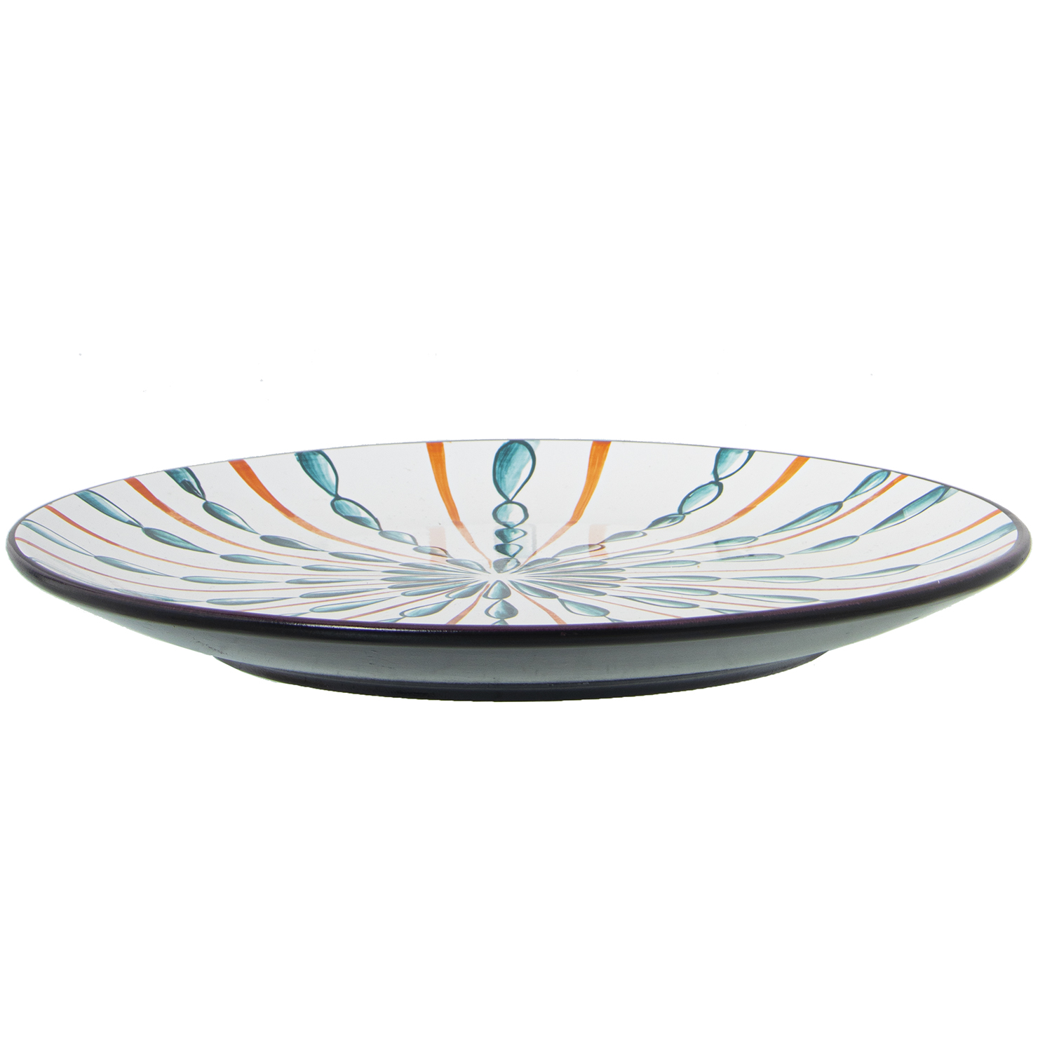 Centro de cerámica blanco con dibujos azules y naranjas.