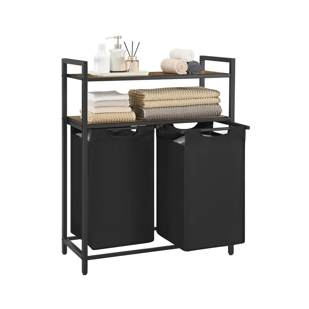 VASAGLE Cesto para Ropa Sucia, Cesta Colada con 2 Bolsas Extraíbles, 2 Estantes, Bolsa Extraíble y Desmontable, 46 L por Bolsa, para Baño, Lavandería, Marrón Rústico y Negro BLH211B01