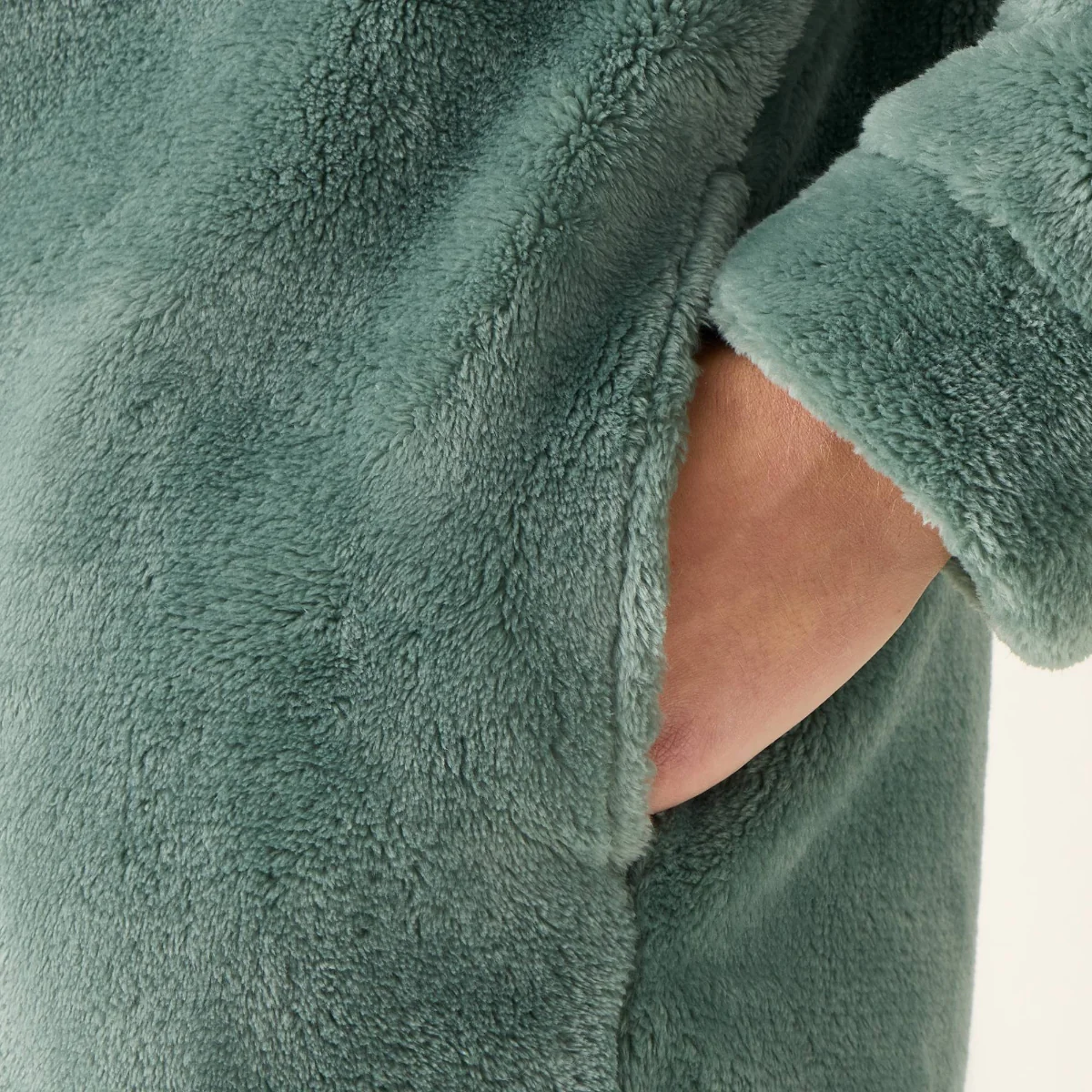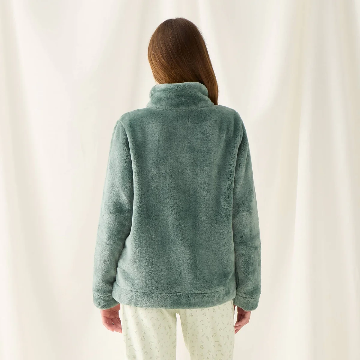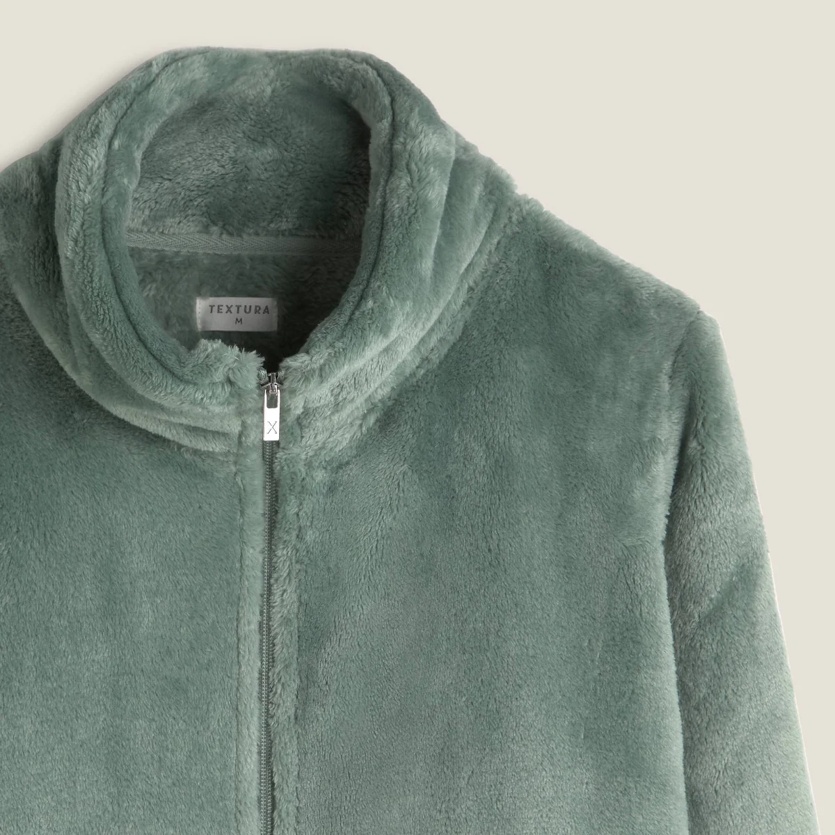 Chaqueta polar efecto pelo en tono verde, suave al tacto, cálida y confortable. Su diseño sencillo y envolvente aporta abrigo sin perder ligereza. Con un gramaje de 370 g, es perfecta para estar en casa con estilo y disfrutar de tus momentos de relax con total comodidad.