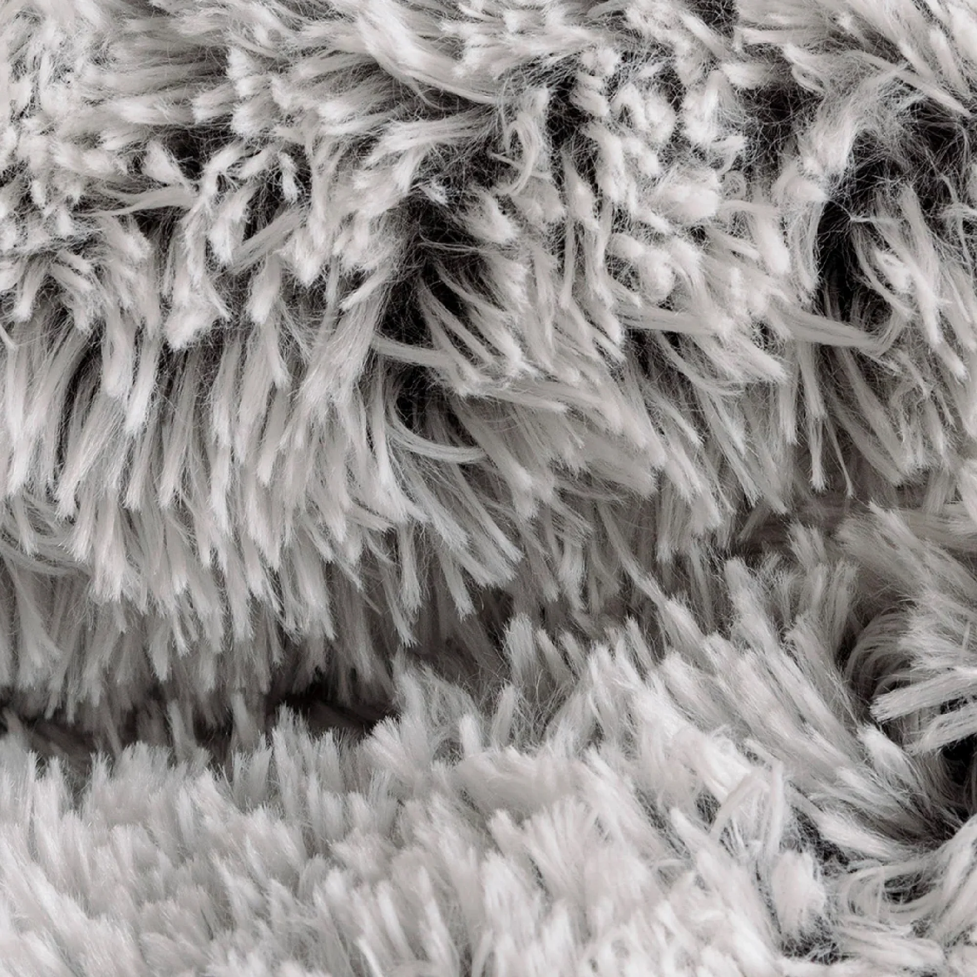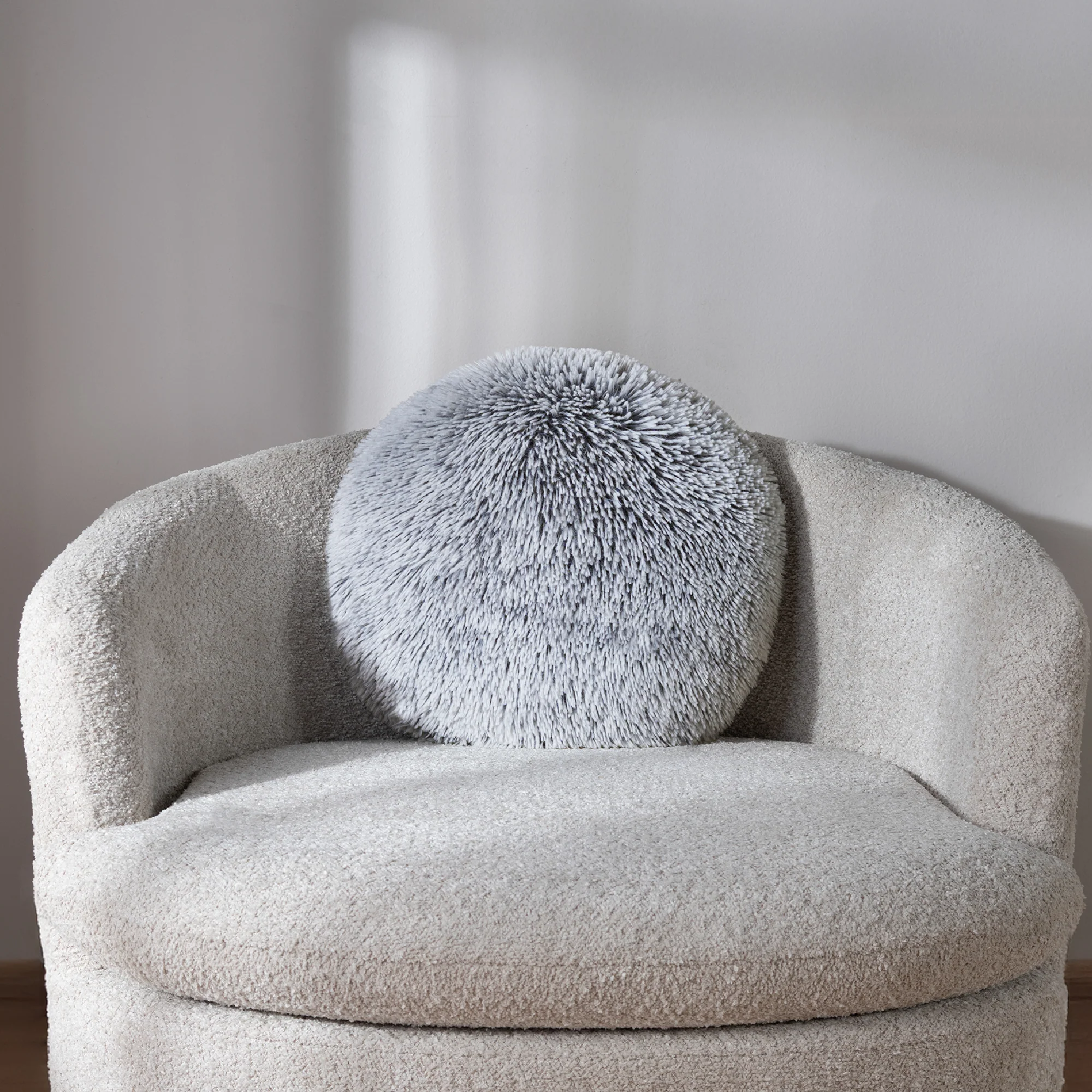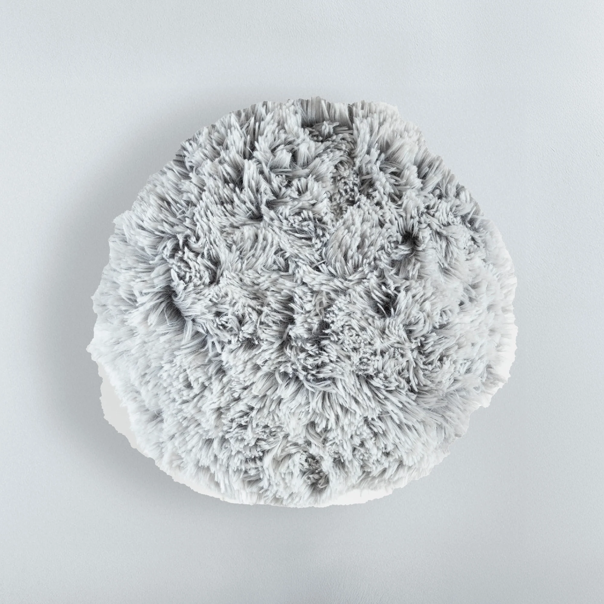 Cojín de textura en pelo largo de forma circular, su diseño es en colores gris con blanco con un toque de degradado.
