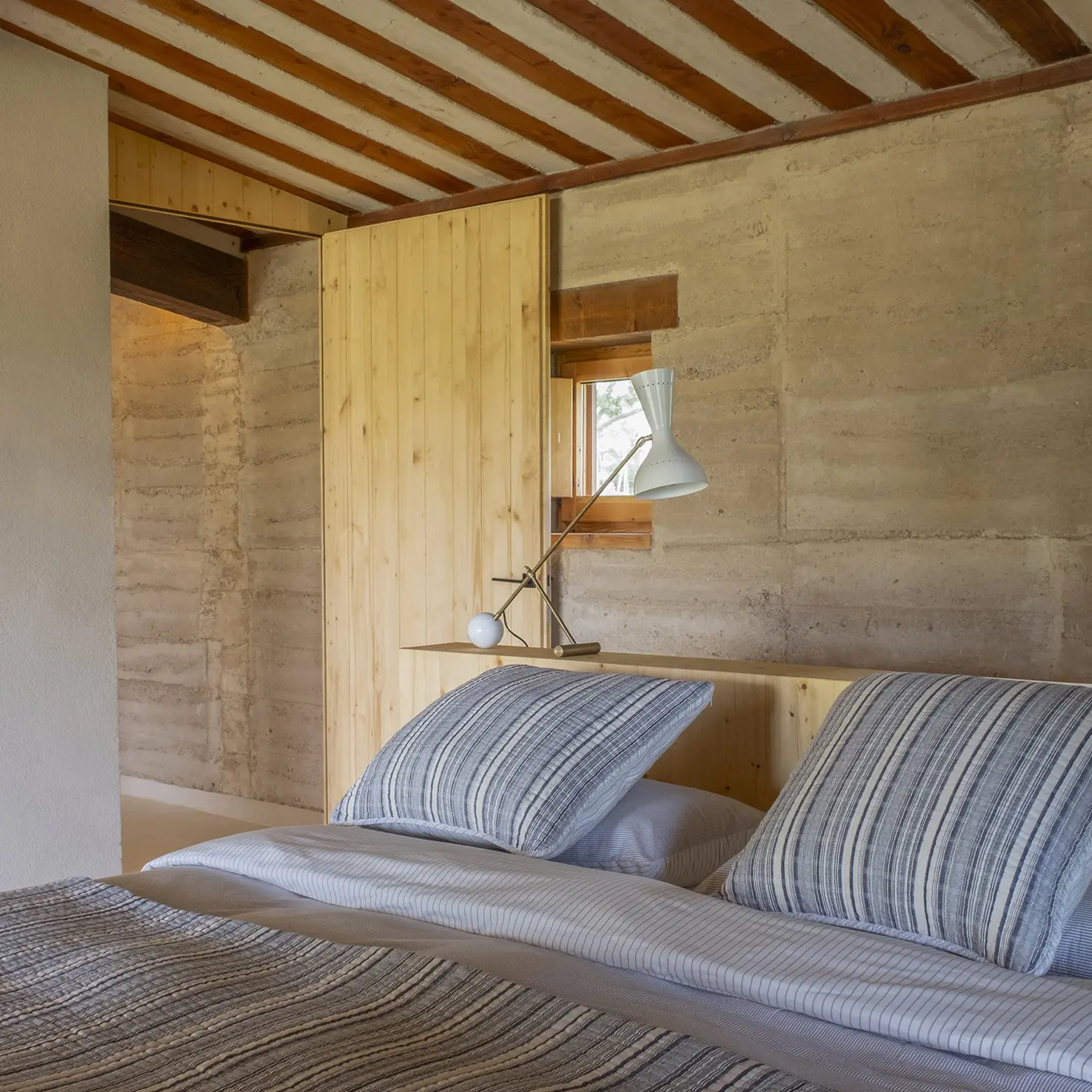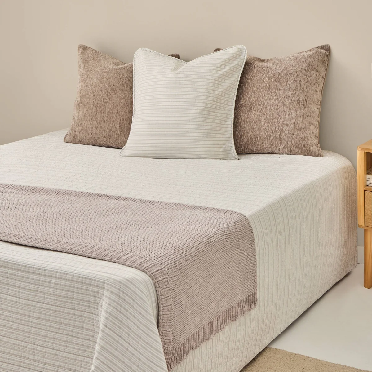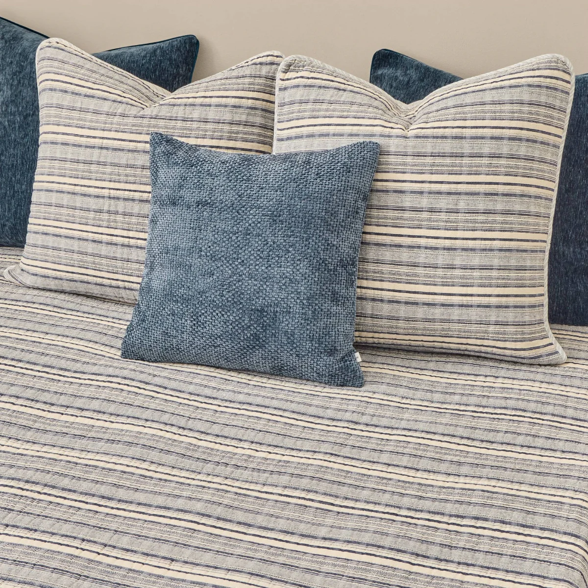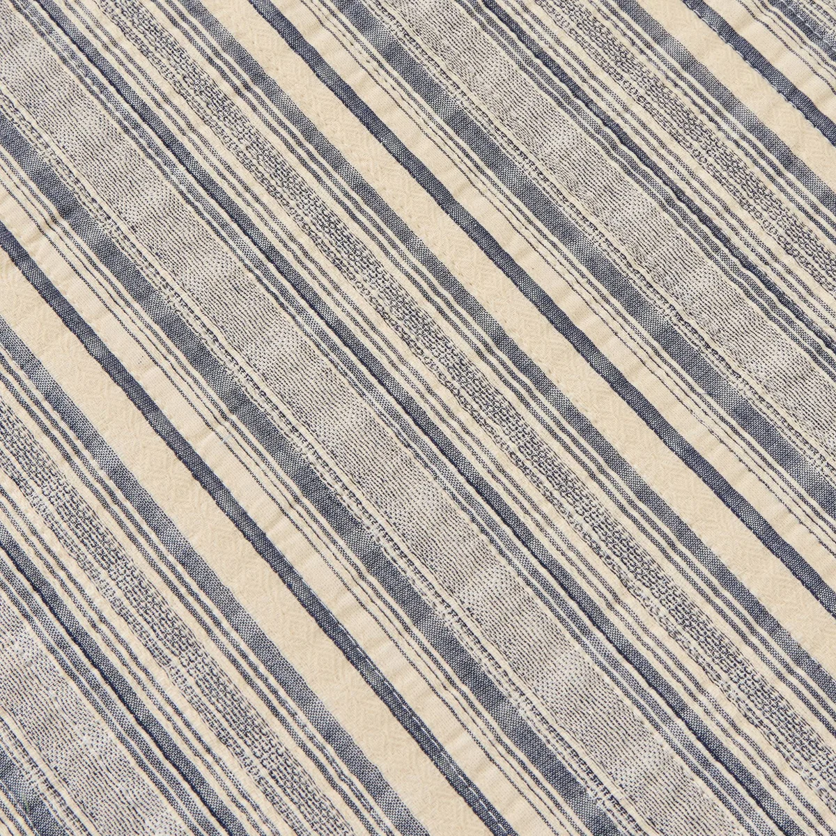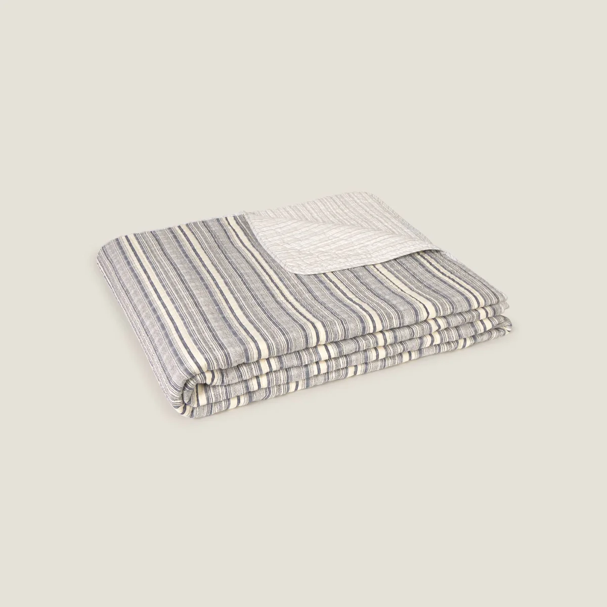 Colcha reversible de algodón 100% con diseño de rayas irregulares en tonos crudo y azul marino. Confeccionada con relleno reciclado de 150 g.