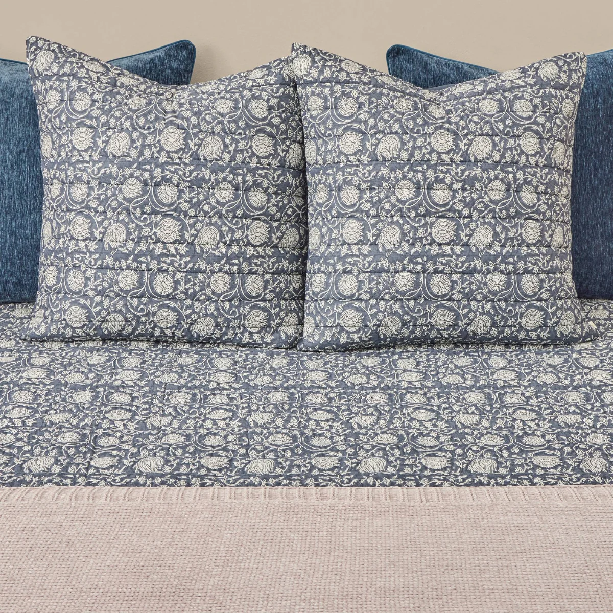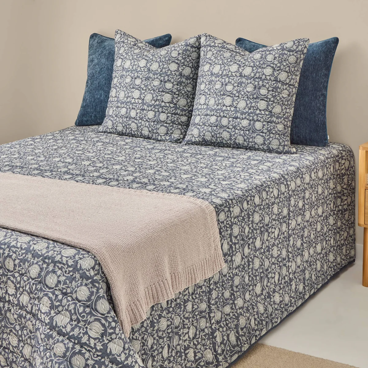 Colcha con estampado floral inspirado en la técnica artesanal block print. Relleno reciclado de 150 g. Escoge la medida teniendo en cuenta el alto de tu colchón y la caída que te guste más. Las medidas de cama del selector de tallas son orientativas. Las fundas de cuadrante se venden por separado.