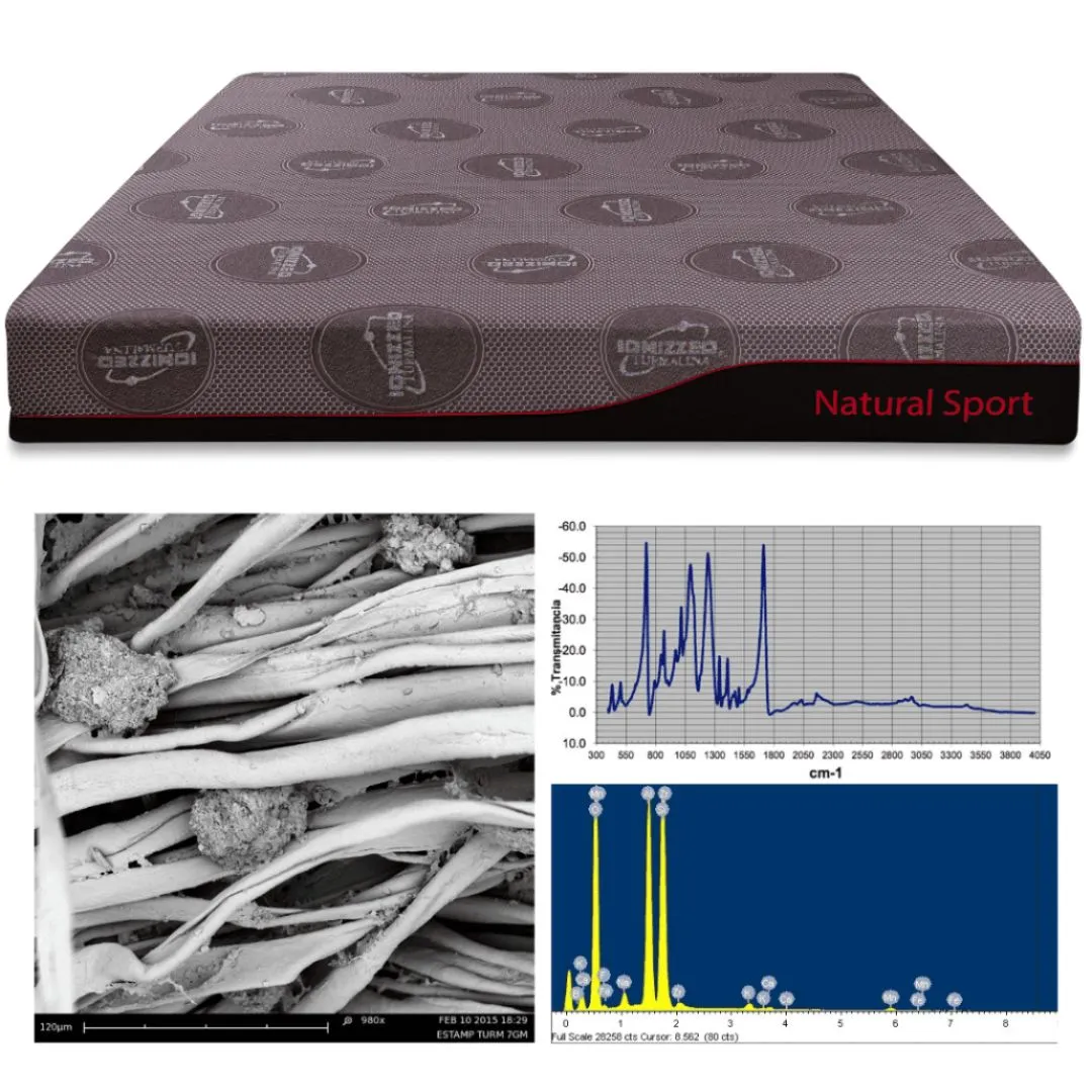 Este colchón para deportistas presenta un segundo tejido Ionizzed con micropartículas biocerámicas de Turmalina cargadas de iones negativos se activan con el roce mientras descansamos, esto genera la emisión de ondas electromagnéticas de infrarrojos las cuales penetran en nuestro organismo consiguiendo efectos anti inflamatorios, analgésicos y antinociceptivos.