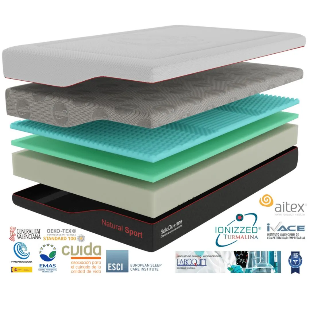 Natural Sport está testado y certificado por especialistas en descanso y organizaciones públicas y privadas. Un colchón para deportistas que apuesta por el I+D y aúna las últimas tecnologías e innovaciones en cada una de las 7 capas que lo conforman para crear un colchón de alta gama y de mejores prestaciones capaz de ayudar a prevenir y aliviar las dolencias musculares, regenerar al cuerpo y proporcionar un sinfín de beneficios para la salud. Ideal para deportistas, aficionados al deporte, personas con dolencias musculares o propensas a tener dolores y, en general, para todas las personas que no descansen correctamente en su colchón actual y que deseen hacerlo como nunca antes lo habían hecho.