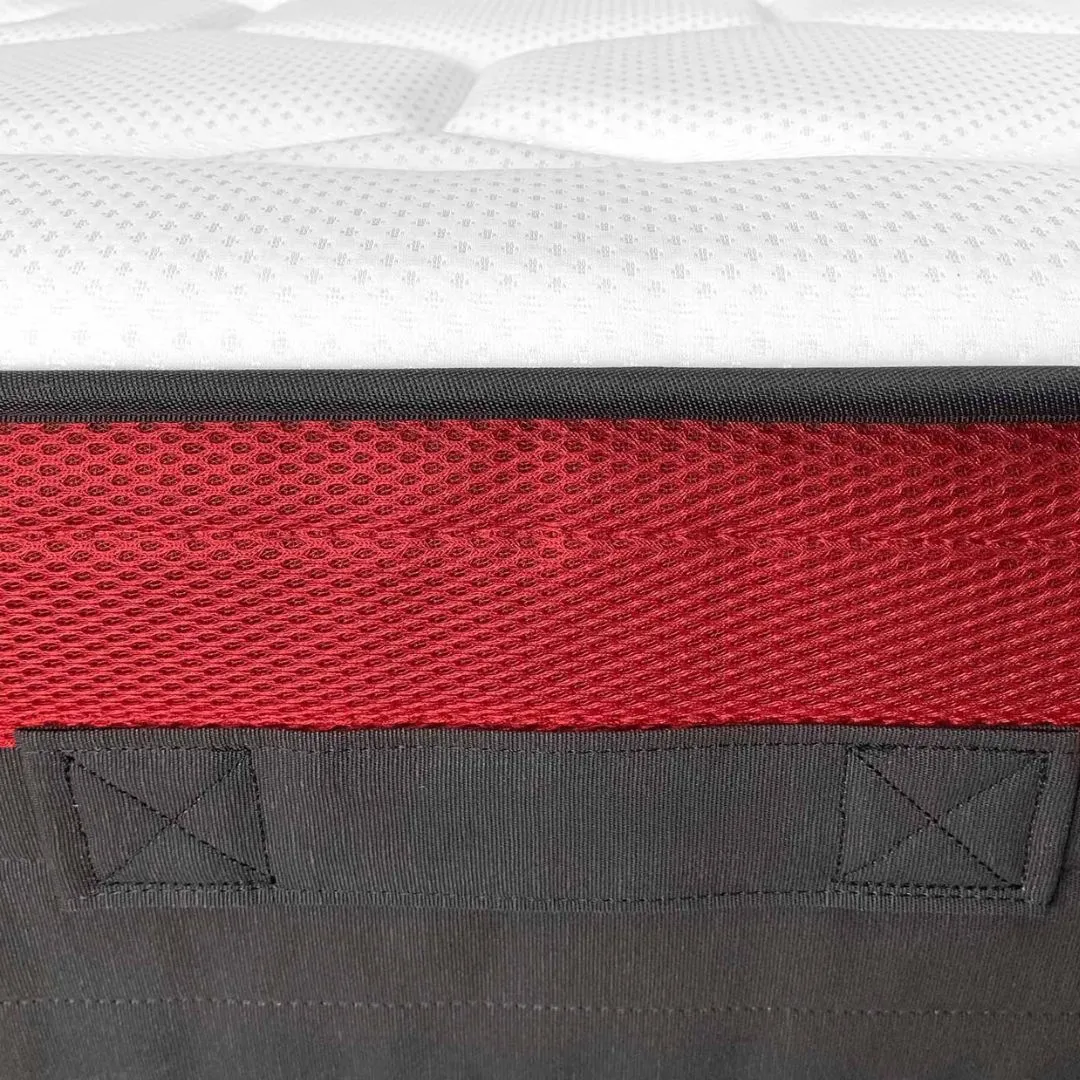 La platabanda lateral del colchón es la encargada de generar una alta estética a la composición y de fomentar la circulación del aire. Está formada por un tejido Texan Vigore y ribete blome desenfundable con 4 asas verticales. Incluye asas de gran sujeción en su una cremallera desenfundable que facilita la higienización del colchón.