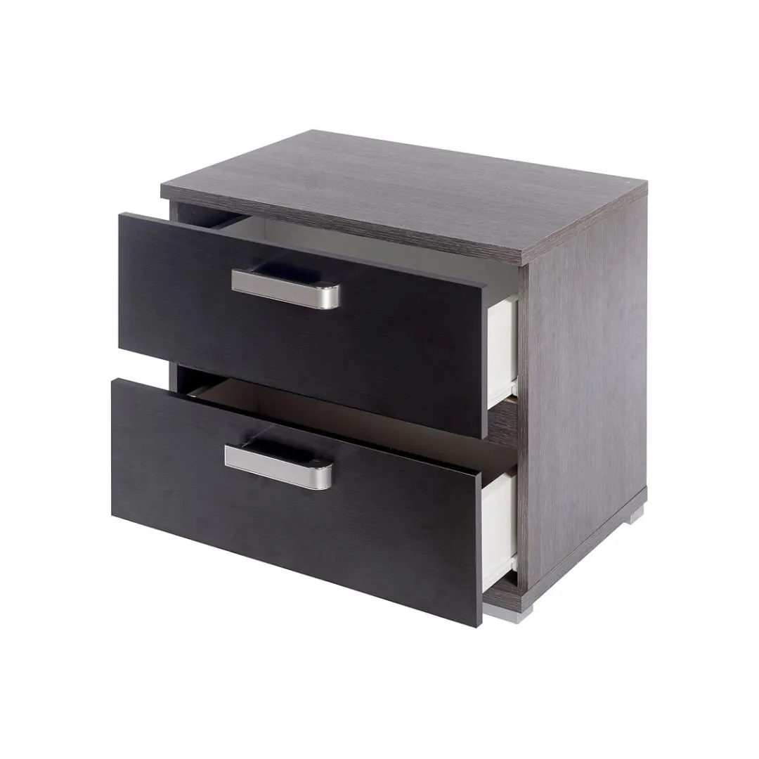 Disfruta de las dos mesitas de noche con dos cajones cada una. Está compuesta por materiales de gran calidad, perfectas para guardar todo lo que te haga falta cerca. Un tablero melaminado de gran resistencia con una combinación de herrajes metálicos y derivados del plástico. Los cajones van con guías metálicas. Disponible en color ceniza-negro