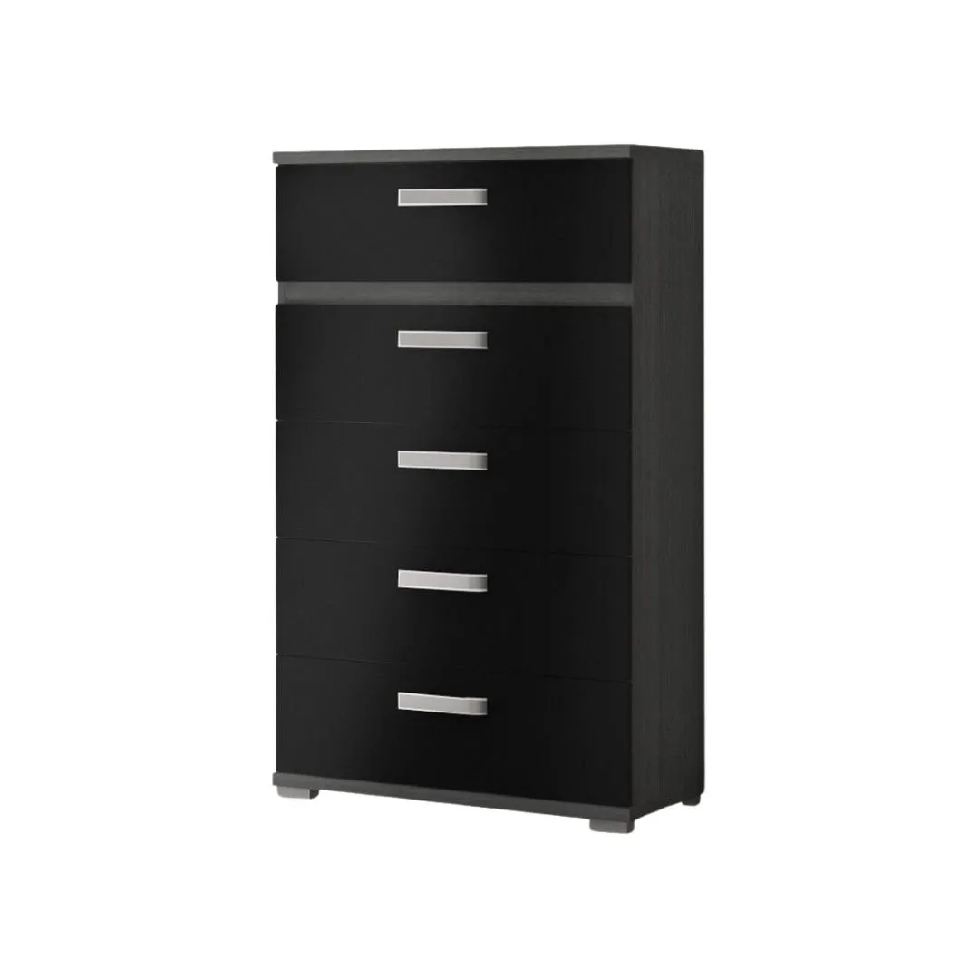 Un sinfonier con 5 cajones. Compuesto por materiales de gran calidad. Un tablero melaminado de gran resistencia con una combinación de herrajes metálicos y derivados del plástico. Los cajones van con guías metálicas. Disponible en acabado ceniza-negro.