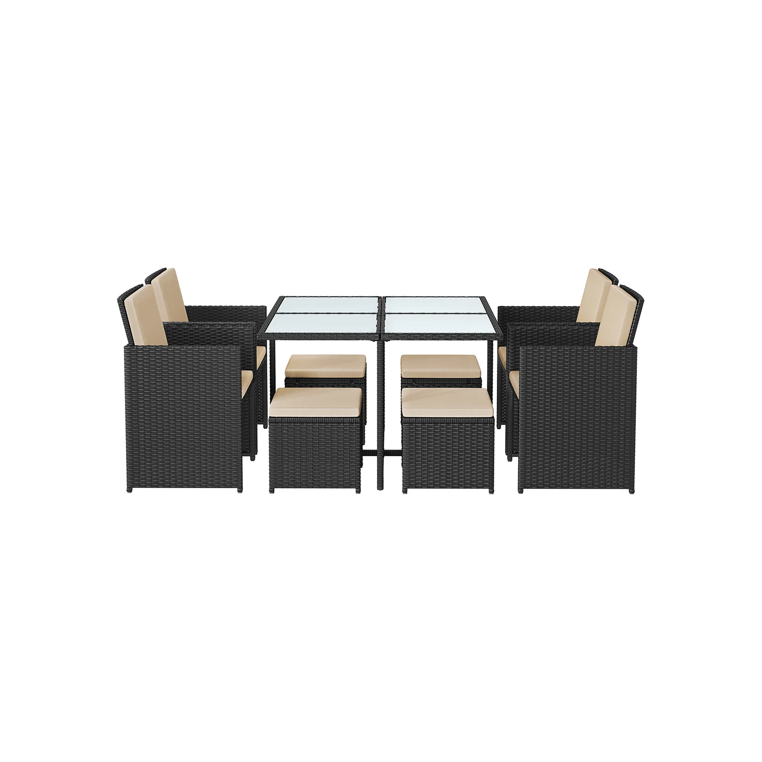 SONGMICS Conjunto de 9 Muebles de jardín de ratán, Exterior, 4 sillas y 4 taburetes, Centro de Mesa con Tapa de Cristal, con Cojines, Fácil de Guardar, Ahorra Espacio, Marrón y Beige GGF009K01
