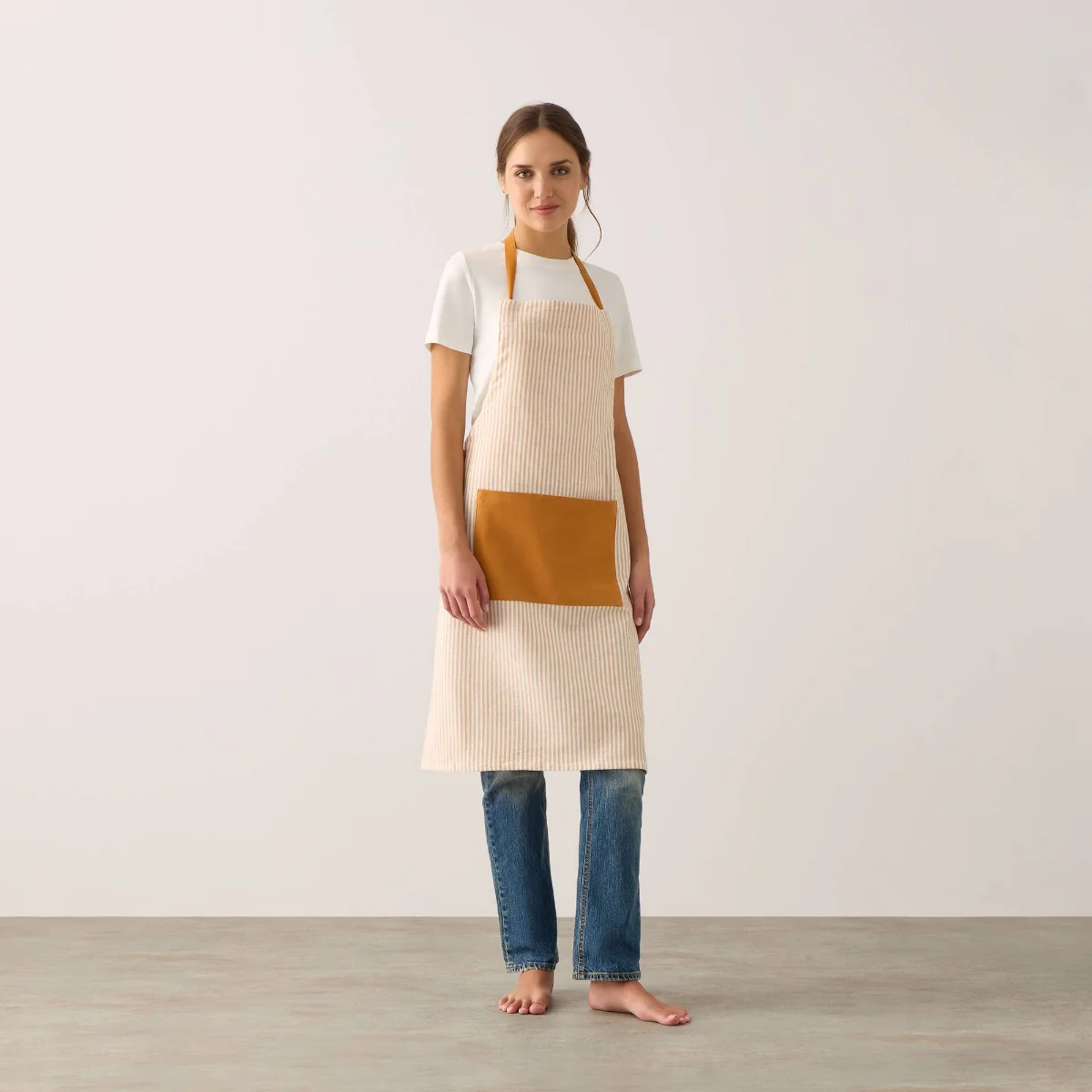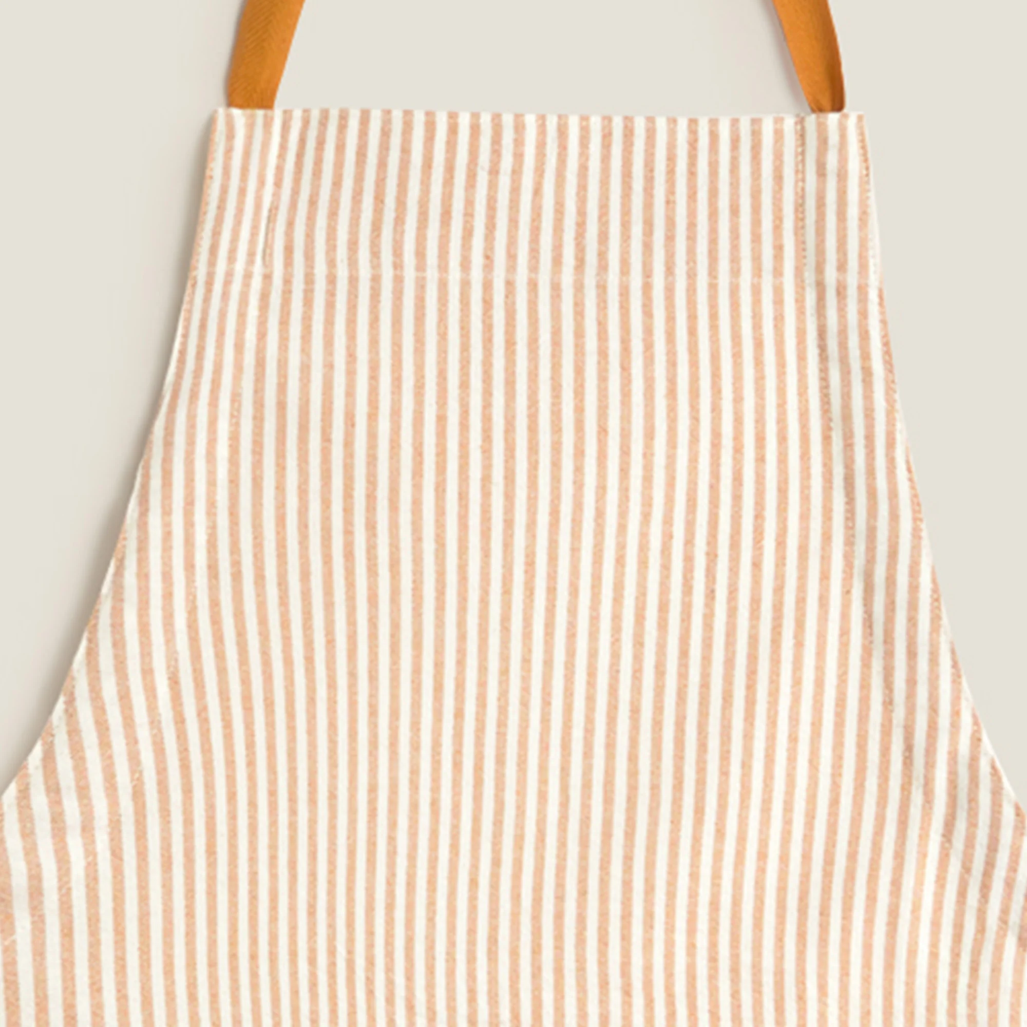 Delantal de algodón con diseño de rayas tejidas en hilo tintado. Con amplio bolsillo central.