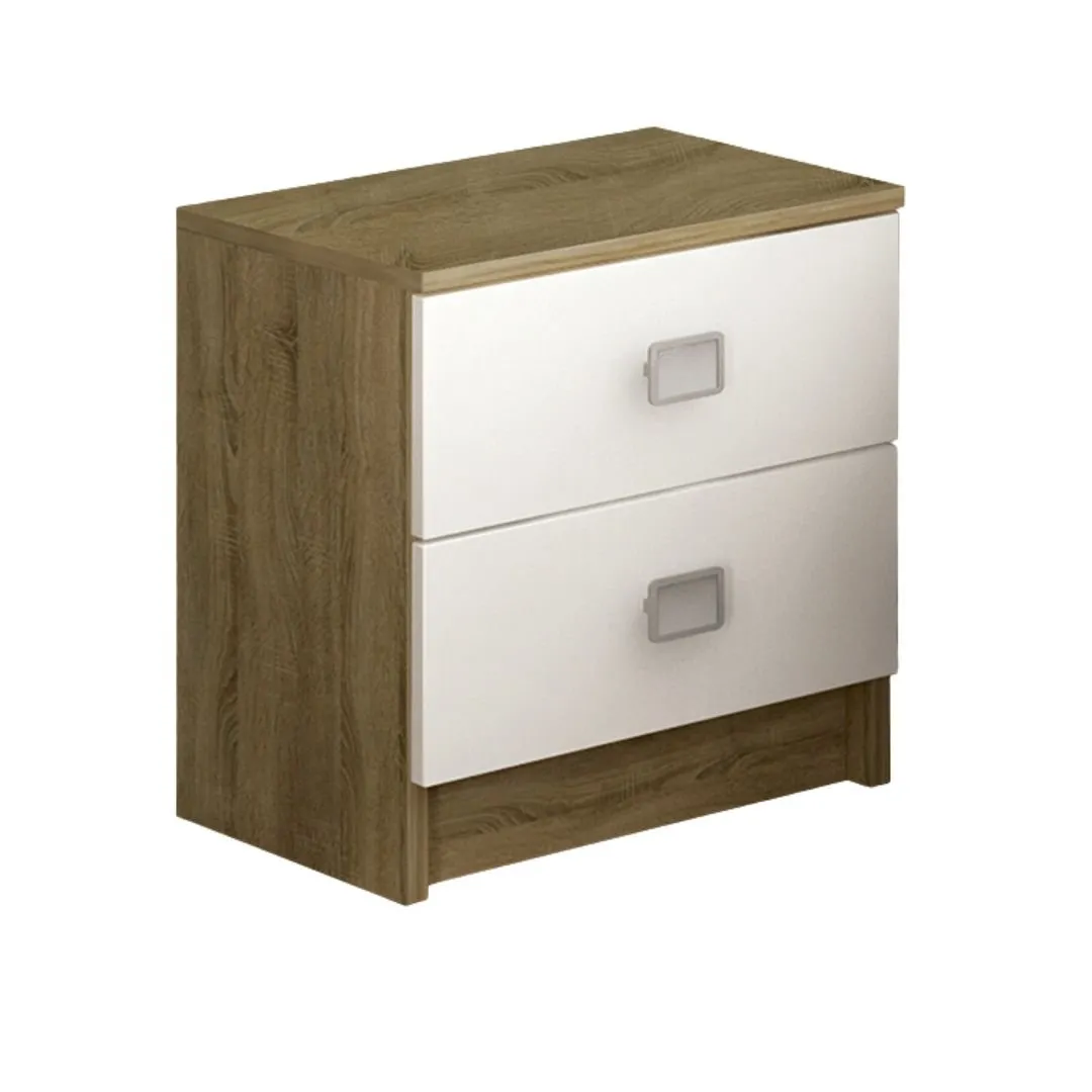 Mesita de noche con dos cajones. Está compuesta por materiales de gran calidad. Un tablero melaminado de gran resistencia con una combinación de herrajes metálicos y derivados del plástico. Los cajones van con guías metálicas. Disponible en color cambria-blanco.