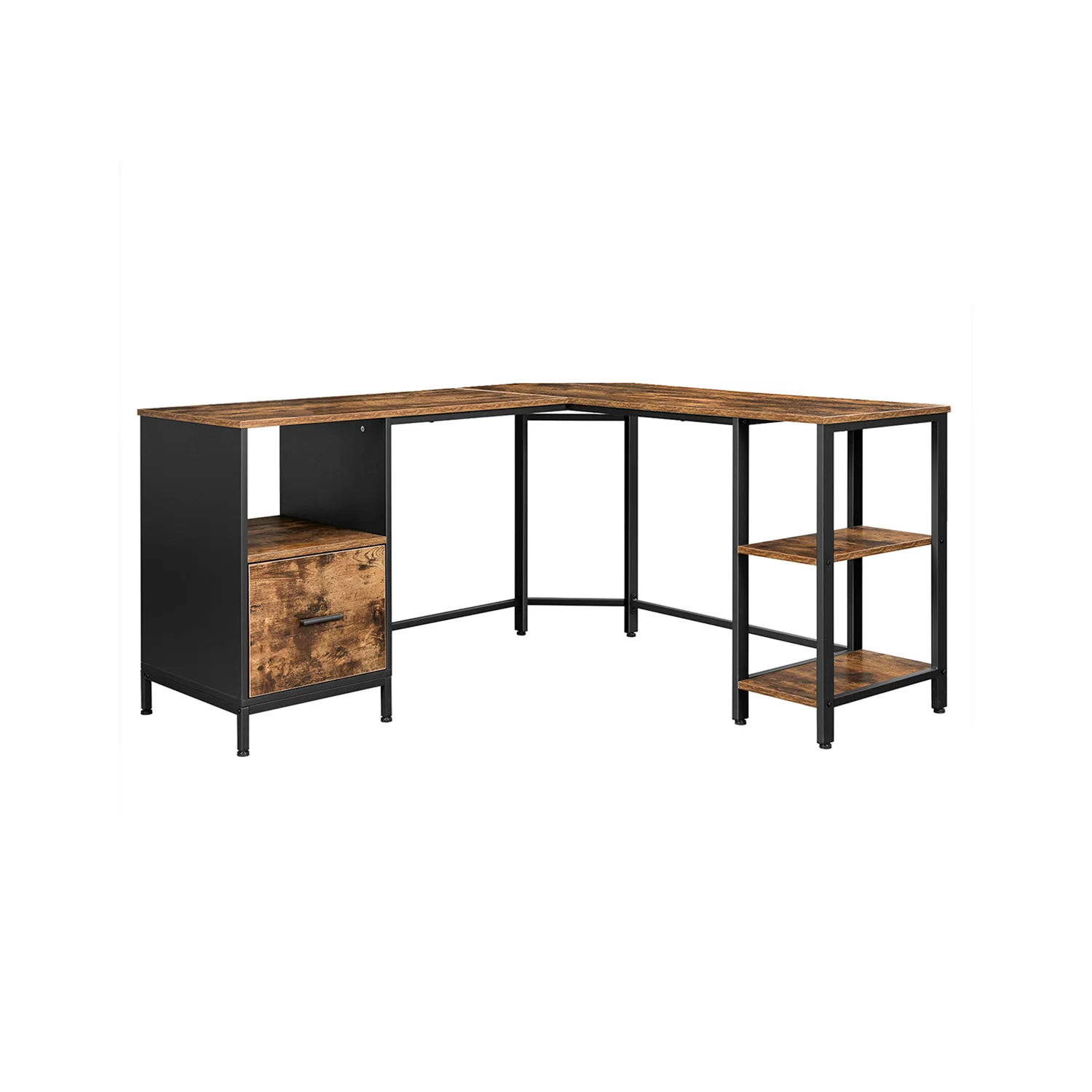 VASAGLE Escritorio de Esquina, Mesa en Forma de L, con Archivador Colgante, 2 Estantes, Oficina en Casa, Fácil de Montar, Marco de Acero, Estilo Industrial, Marrón Rústico y Negro LWD75X