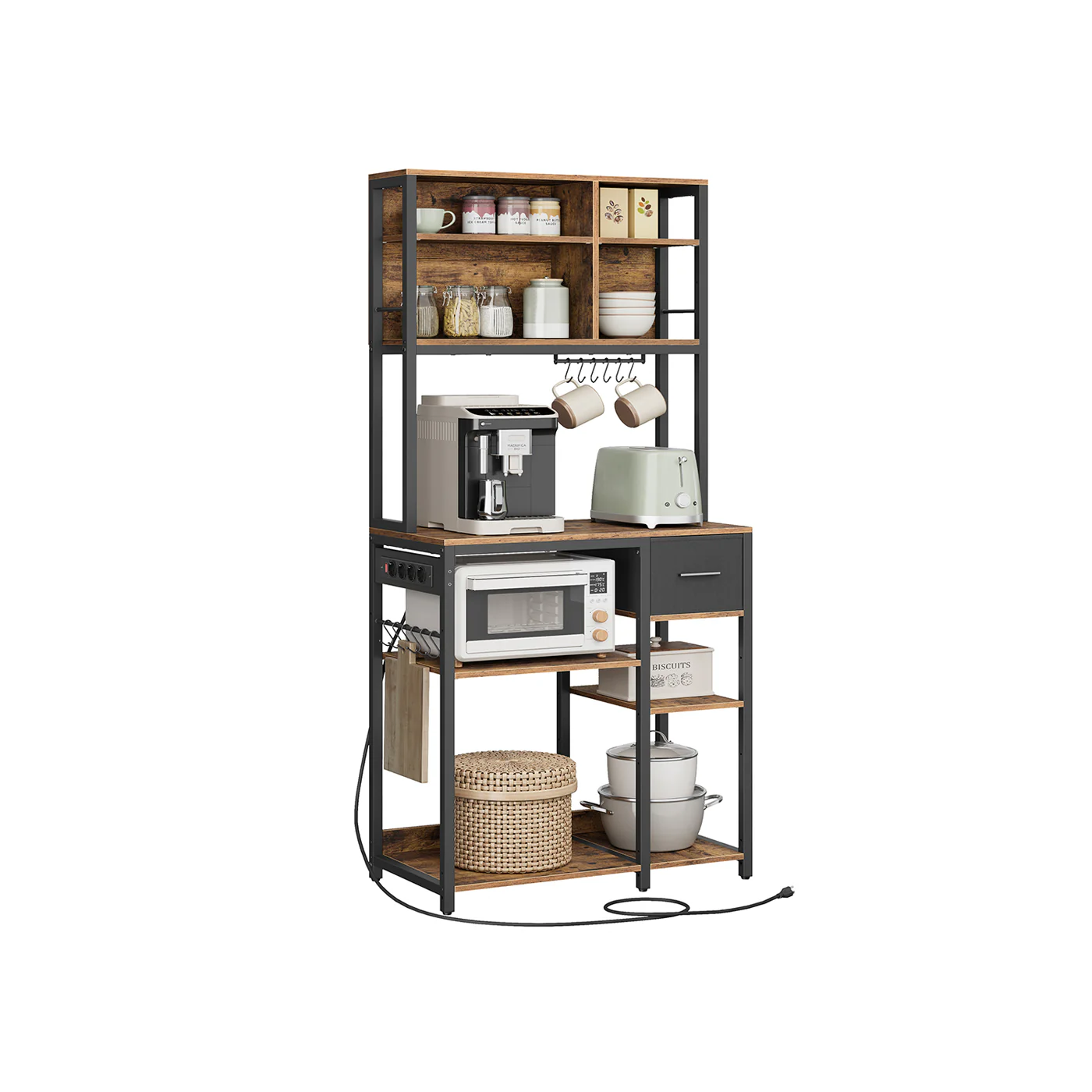 VASAGLE Estantería de Cocina con Multienchufe, Armario de Cocina con Estantes Ajustables, Cajón de Tela, 12 Ganchos, 40 x 80 x 180,4 cm, Estante de Microondas, Marrón Rústico y Negro Tinta KKS015K03