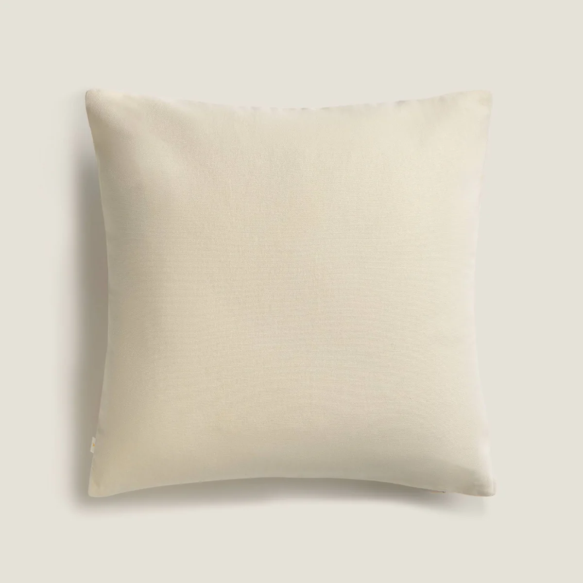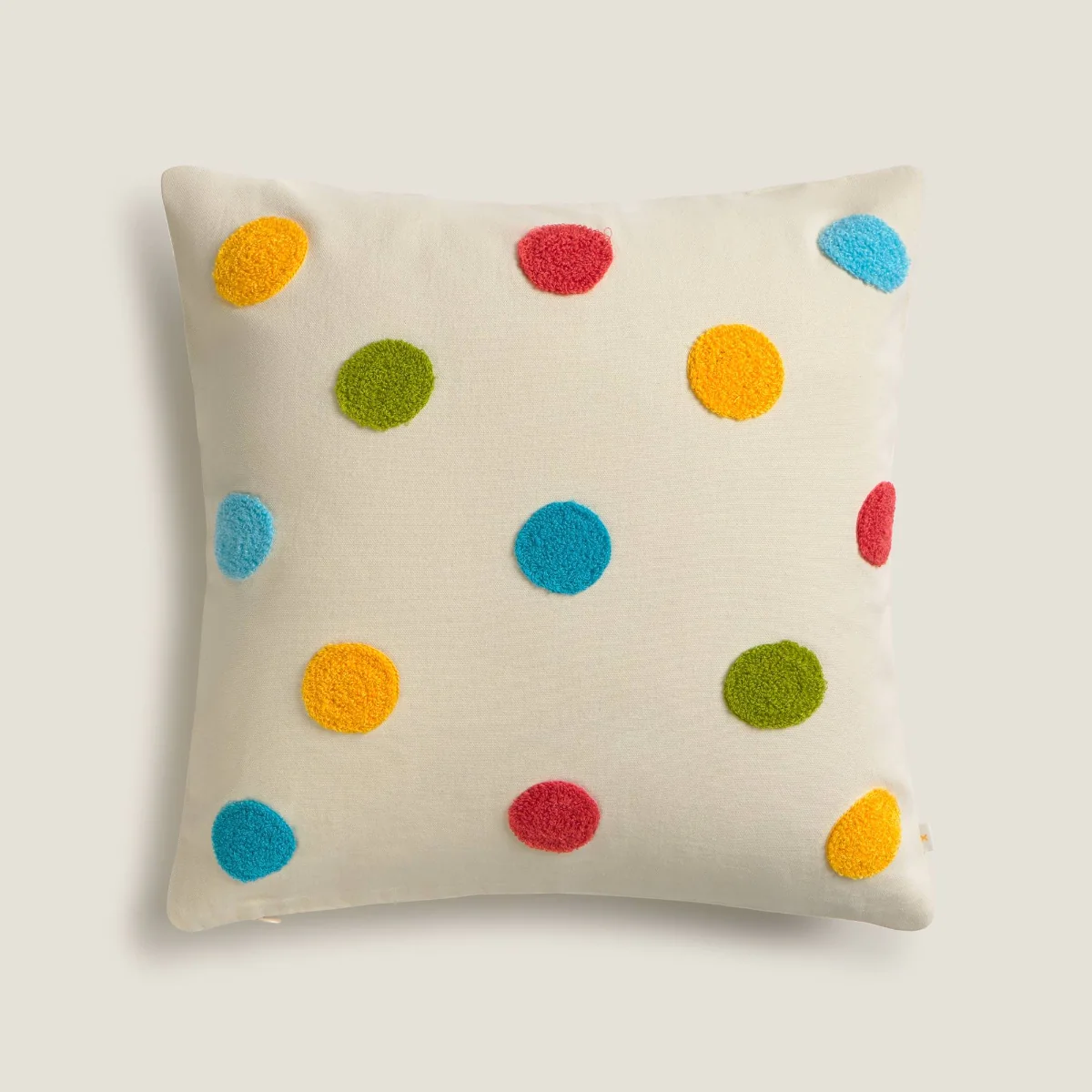 Funda de cojín de algodón con motivo de lunares de colores utilizando diferentes técnicas de bordado. Se cierra con cremallera invisible.