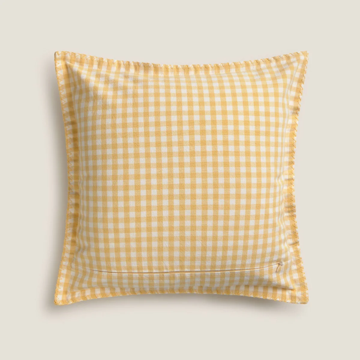 Funda de cojín de algodón con diseño de cuadros vichy y detalle de acabado punto manta en los laterales. Se cierra con cremallera oculta en la parte posterior.