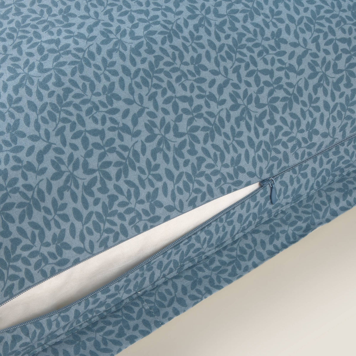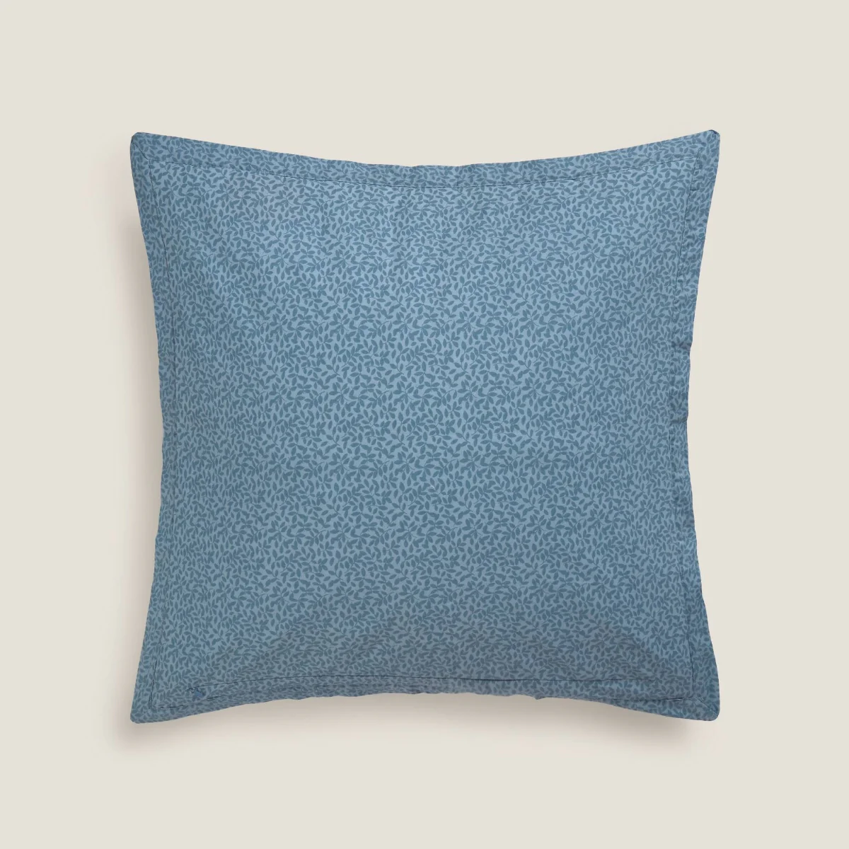 Funda de cuadrante de patchwork confeccionada en algodón con relleno de fibras recicladas. Diseño artesanal con formas florales en tonos azules y contorno estampado. Relleno opcional: El relleno se vende por separado.