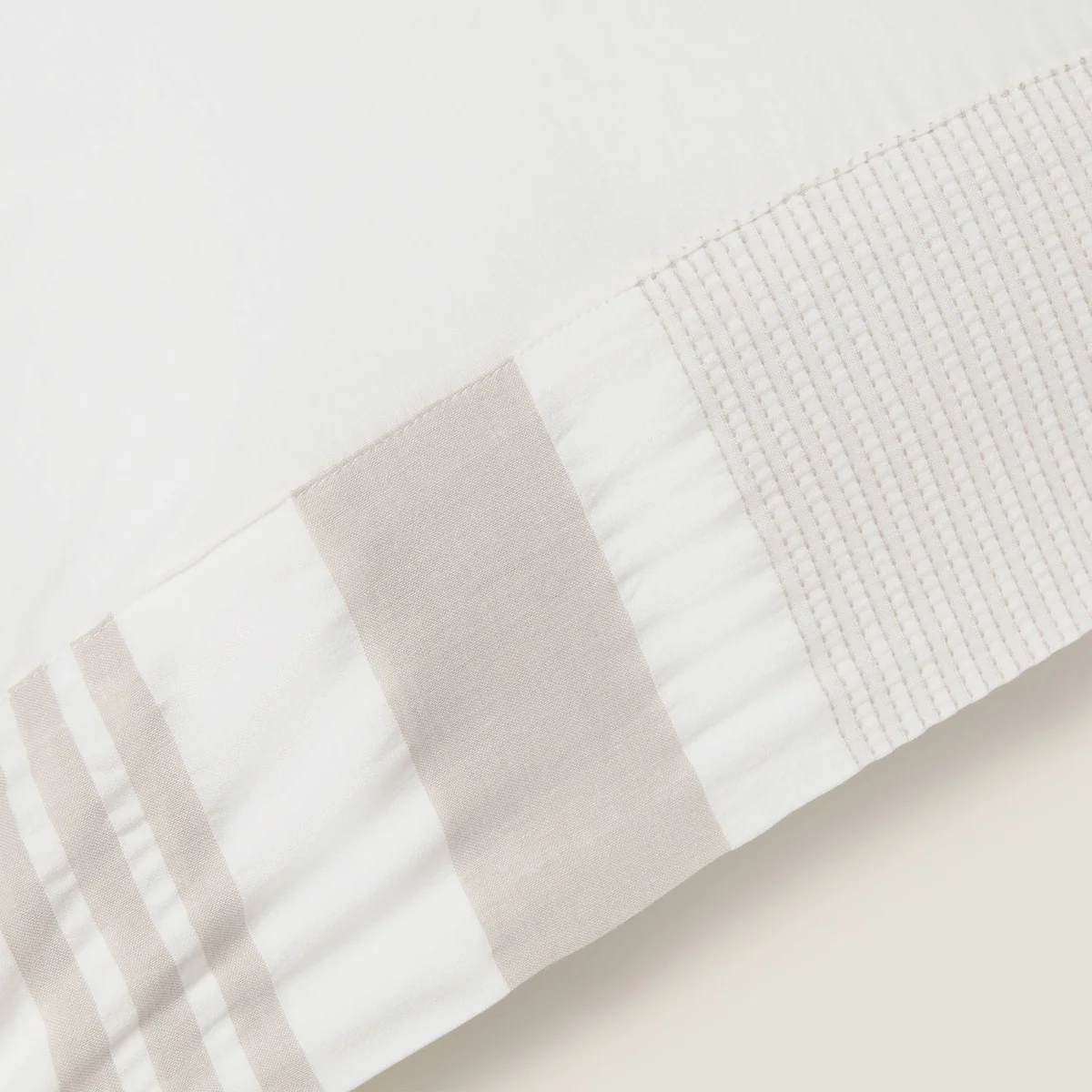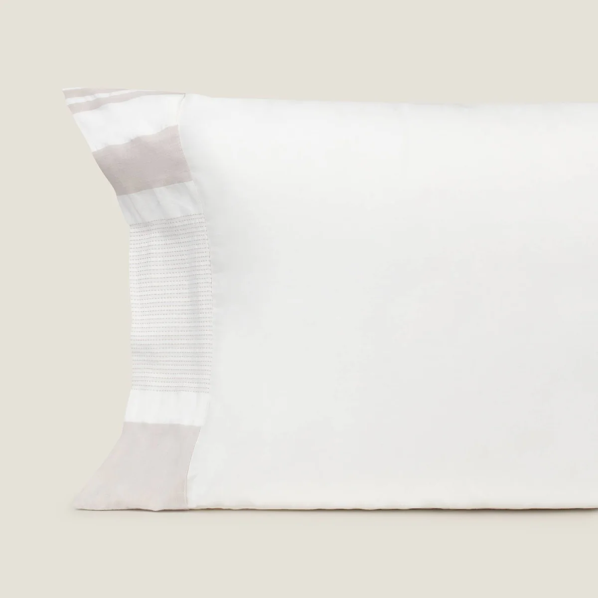 Funda de almohada de algodón 100% de 180 hilos, lisa y con extremo de tejido seersucker a rayas. Se cierra con solapa. Las medidas 50×75 cm y 65×65 cm incluyen dos unidades.