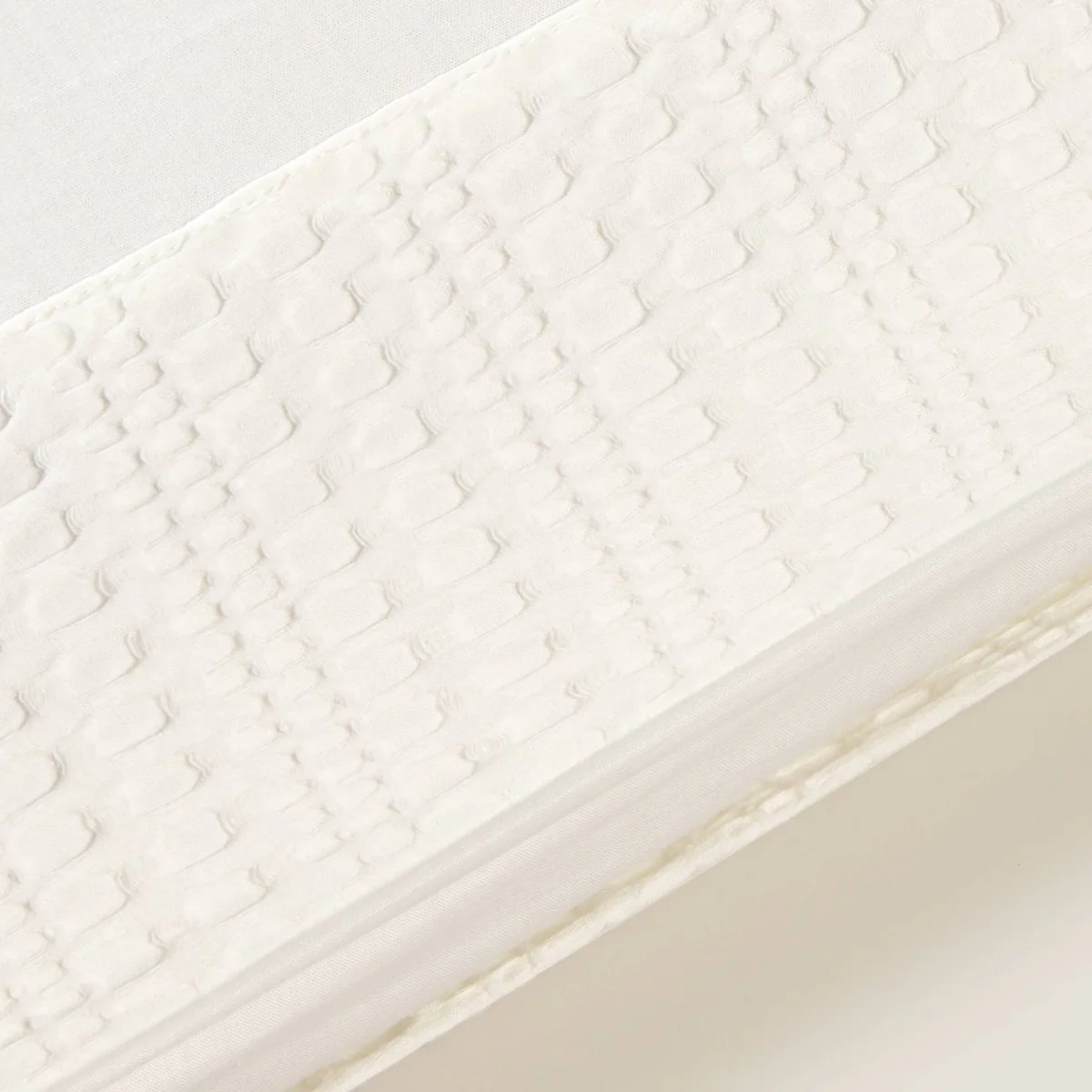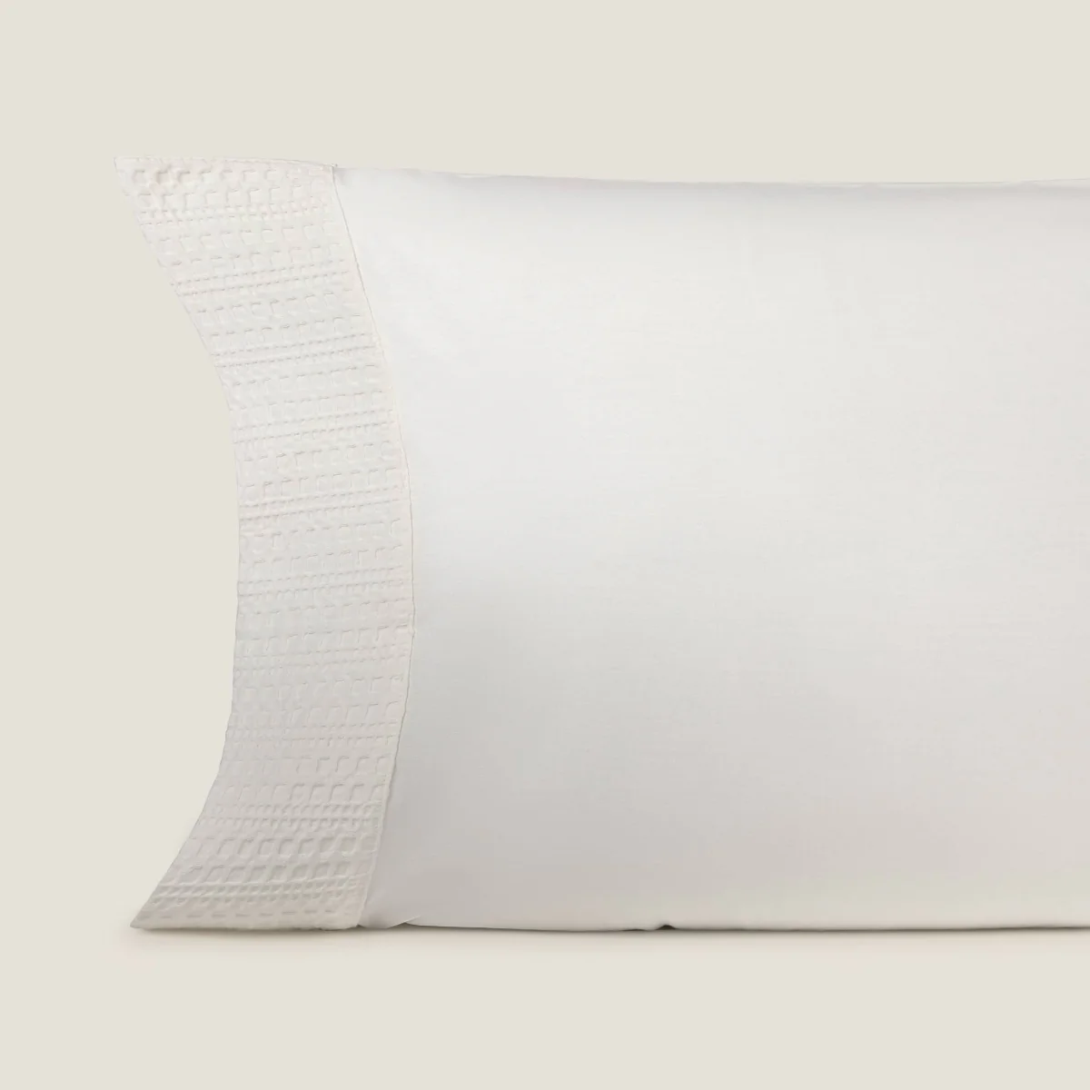 Funda de almohada de algodón 100% con un delicado diseño texturizado en blanco. Una propuesta suave y luminosa que aporta elegancia discreta al dormitorio. Las medidas 50×75 cm y 65×65 cm se venden en set de 2 unidades.