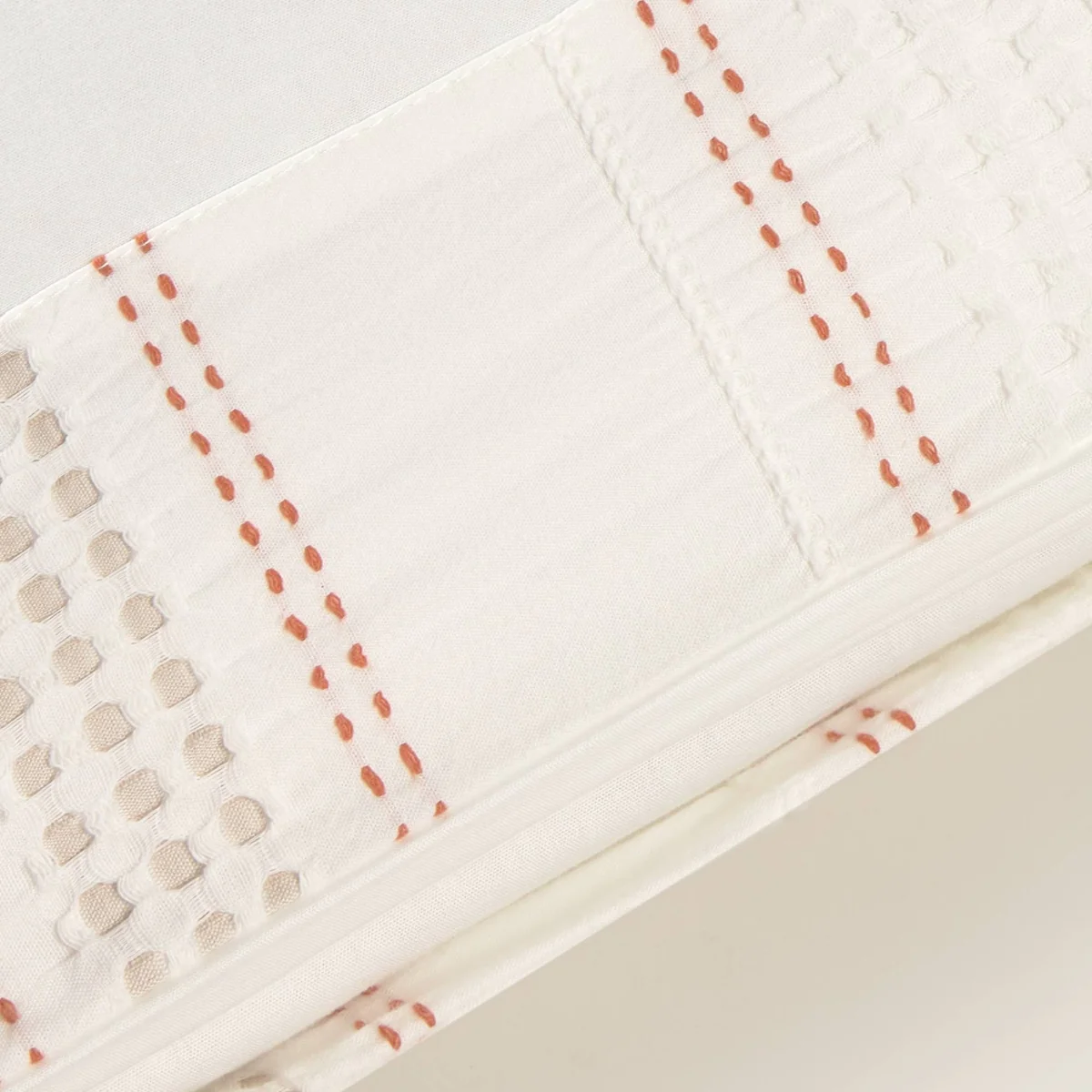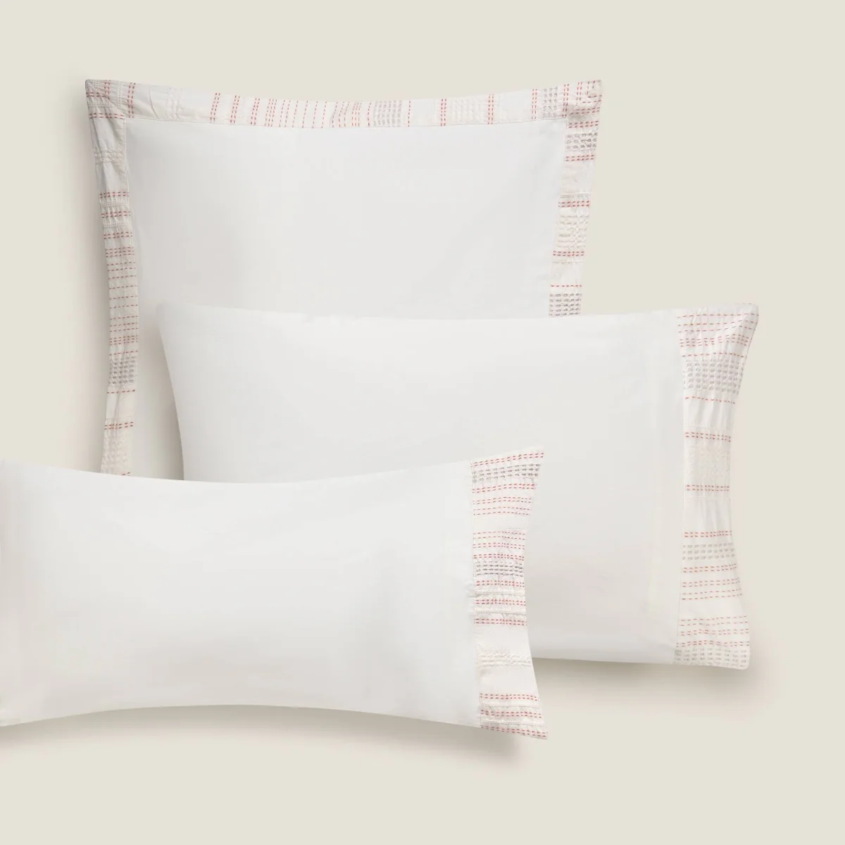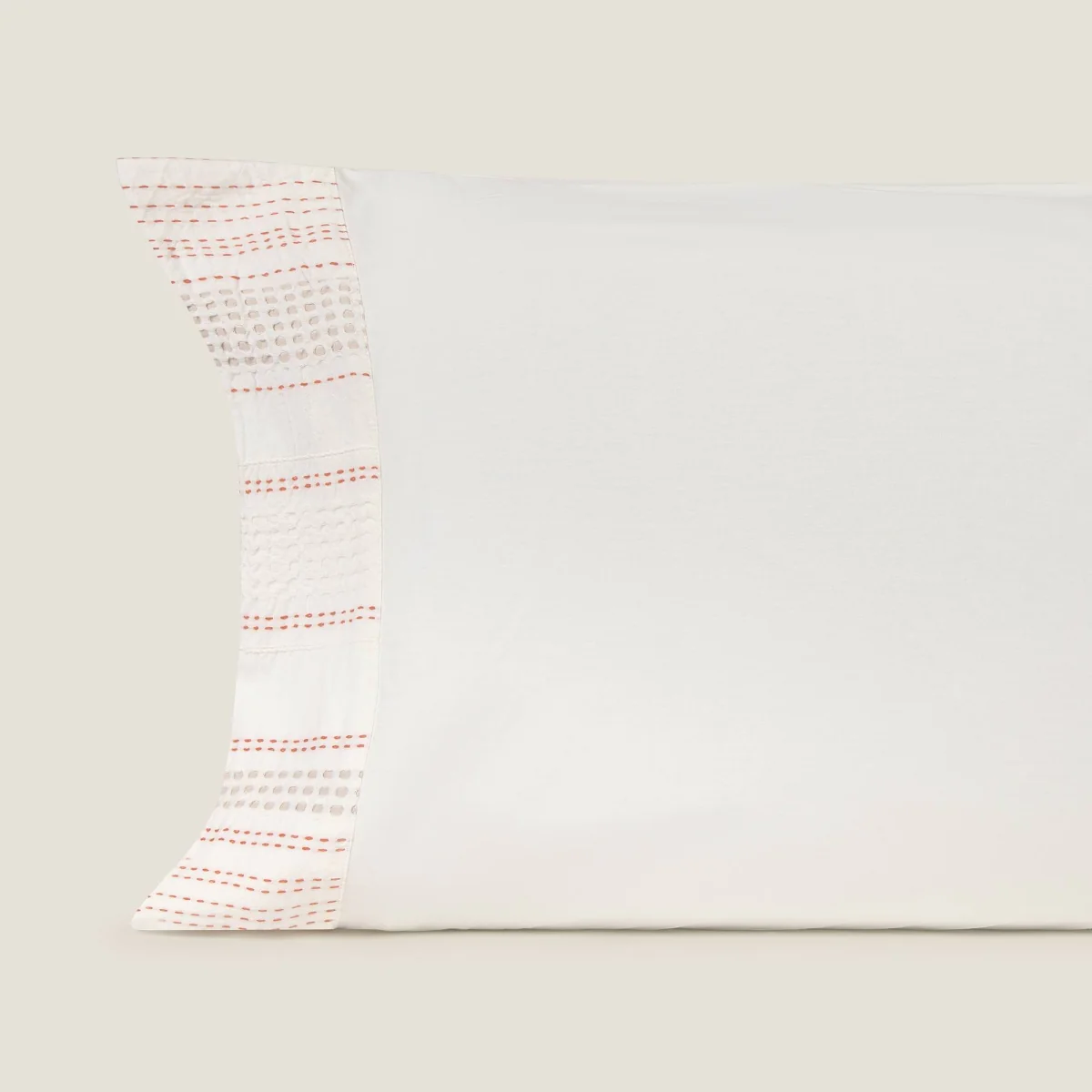 Funda de almohada de algodón 180 hilos con detalle texturizado y diseño en tonos tejas y neutros. Una propuesta elegante y suave que aporta equilibrio visual al dormitorio. Las medidas 50×75 cm y 65×65 cm se venden en set de 2 unidades.