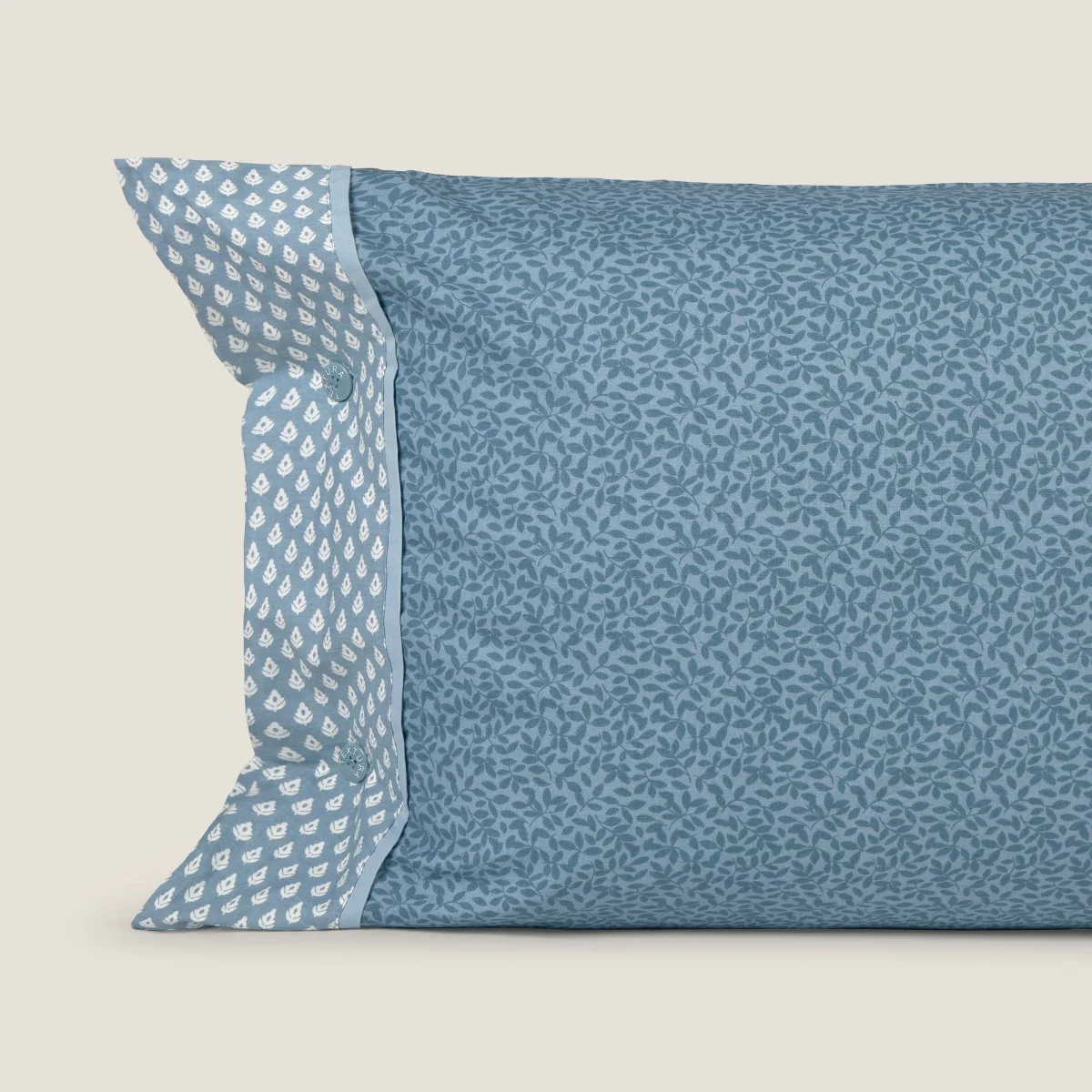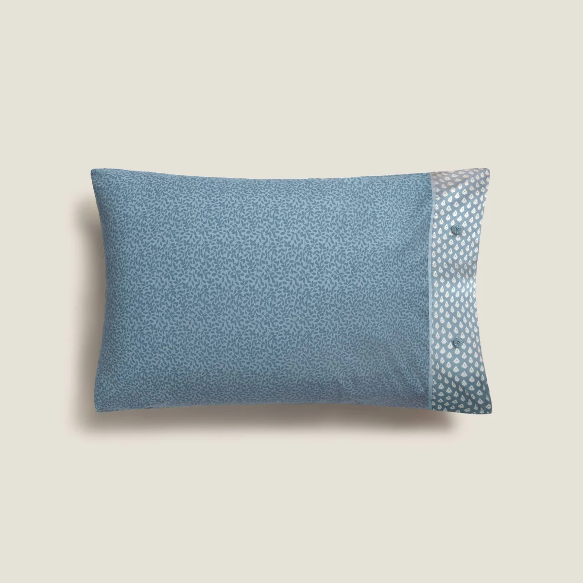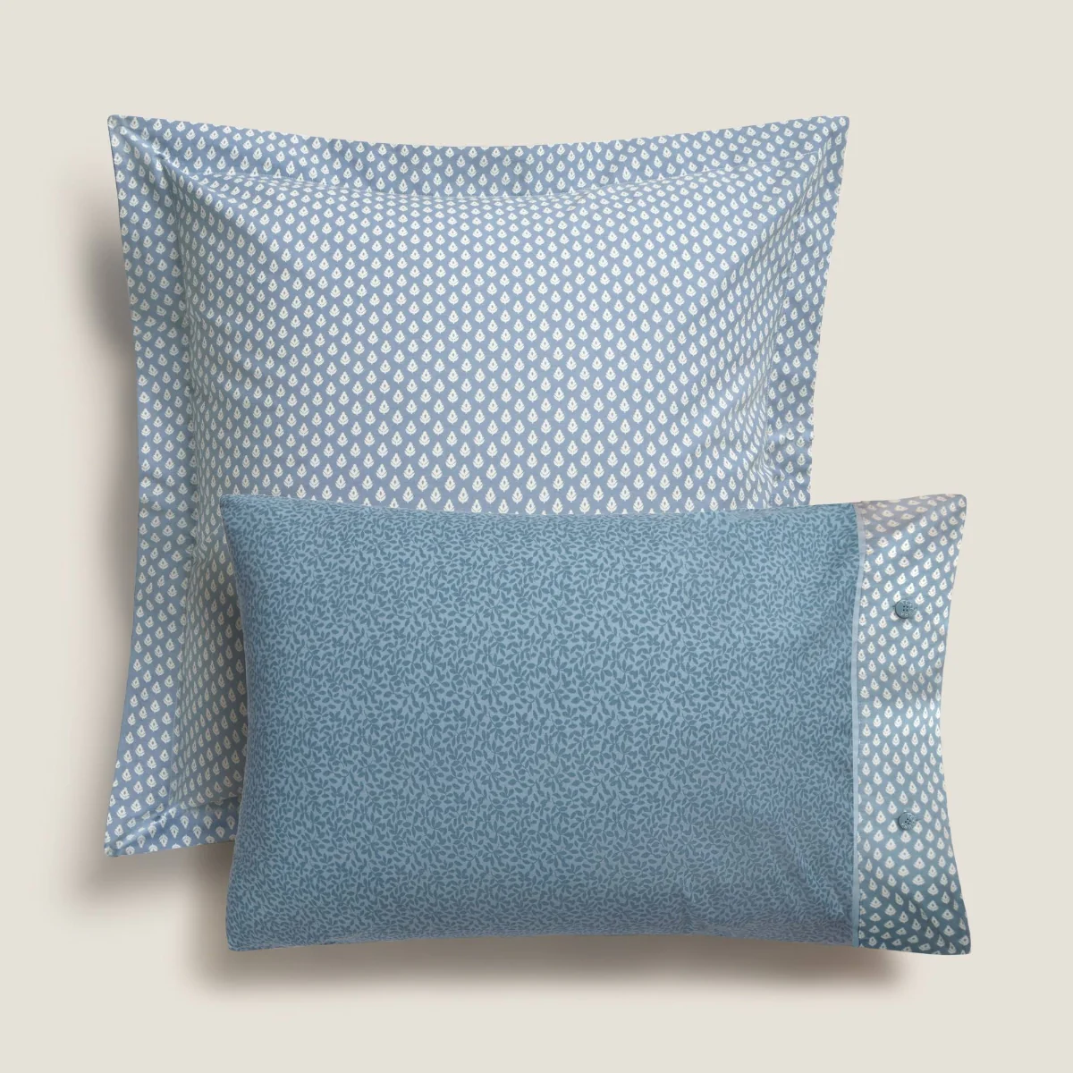 Funda de almohada de algodón 100% con estampado en tonos azulados y detalles florales. Un diseño relajante y decorativo que transforma el dormitorio con un aire romántico y sereno. Las medidas 50×85 cm y 65×65 cm se venden en set de 2 unidades.