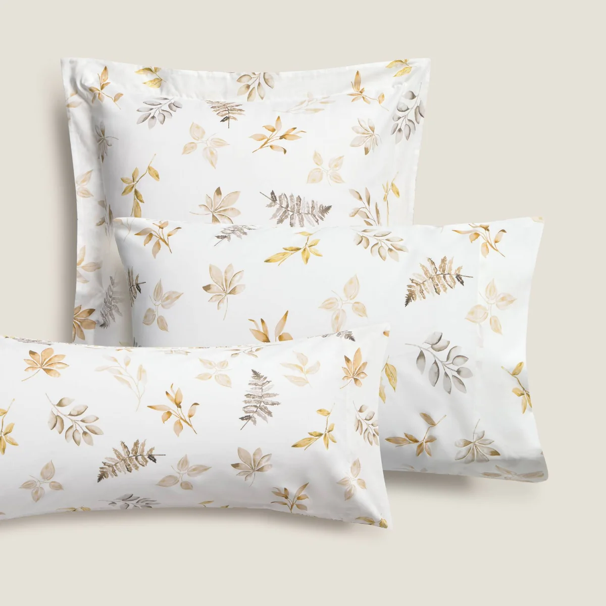 Funda de almohada reversible de algodón percal de 180 hilos con diseño vegetal en tonos tierra. Las medidas 50×85 cm y 65×65 cm se venden en set de 2 unidades.