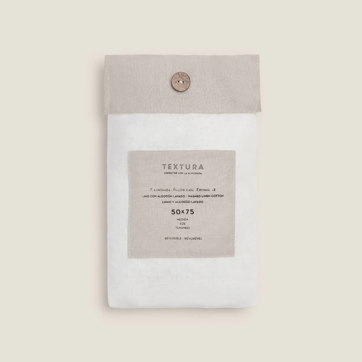 Funda de almohada de lino y algodón reversible. Cada cara es de un color. Se cierra con solapa. La medida 50×75 cm incluye dos unidades.