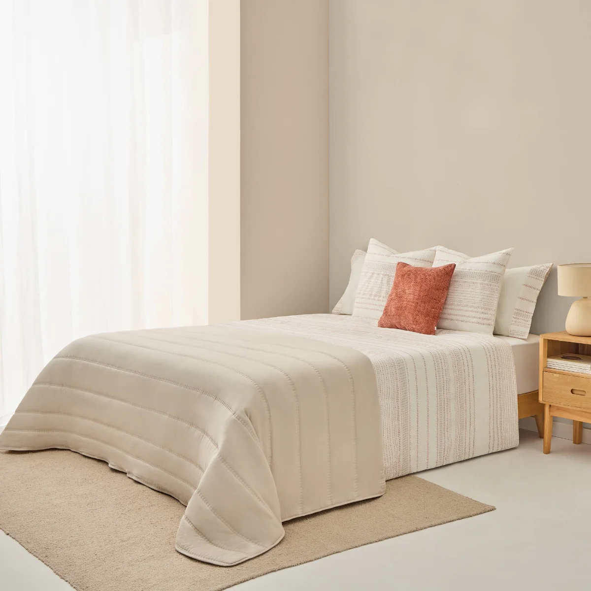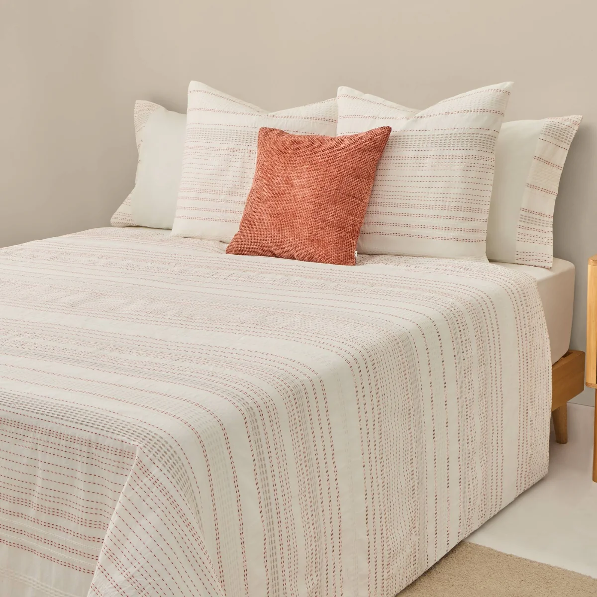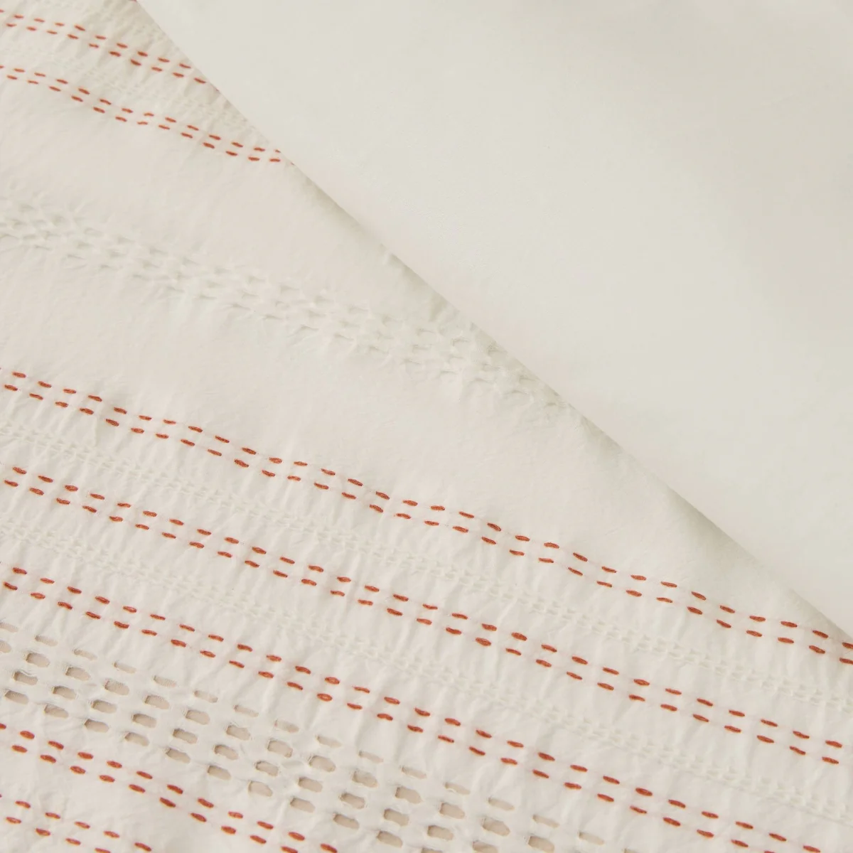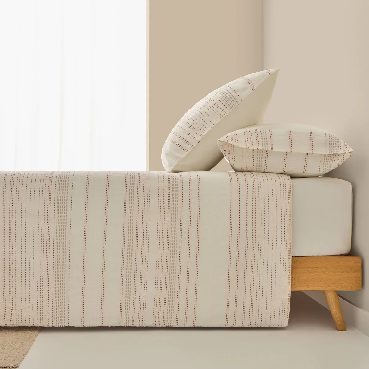 Funda nórdica con rayas en tonos teja y tejido texturizado en algodón 100%. Parte trasera en percal liso de 180 hilos. Cierre con botones. Las fundas de almohada se venden por separado.