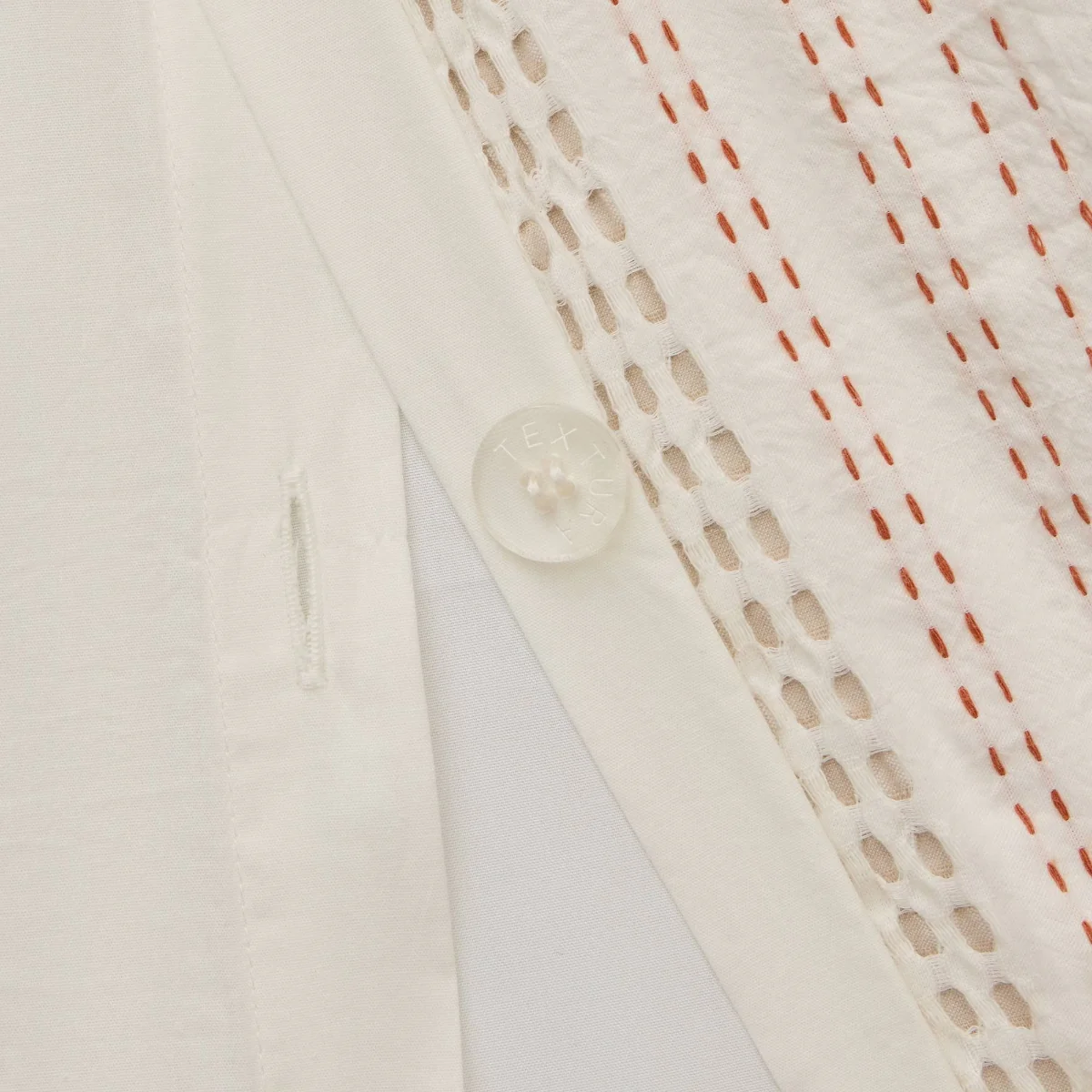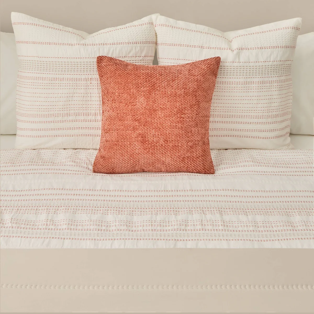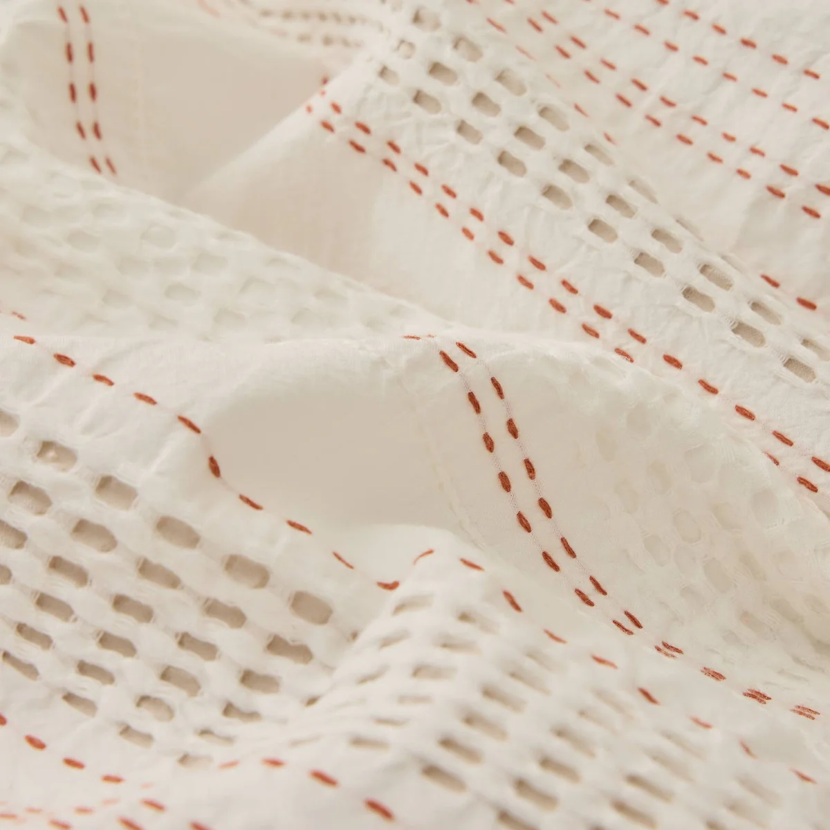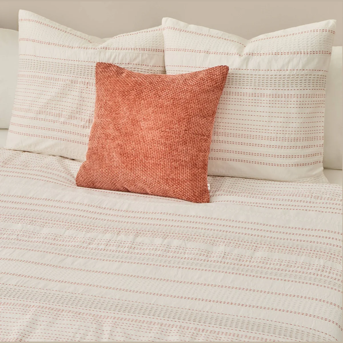 Funda nórdica con rayas en tonos teja y tejido texturizado en algodón 100%. Parte trasera en percal liso de 180 hilos. Cierre con botones. Las fundas de almohada se venden por separado.