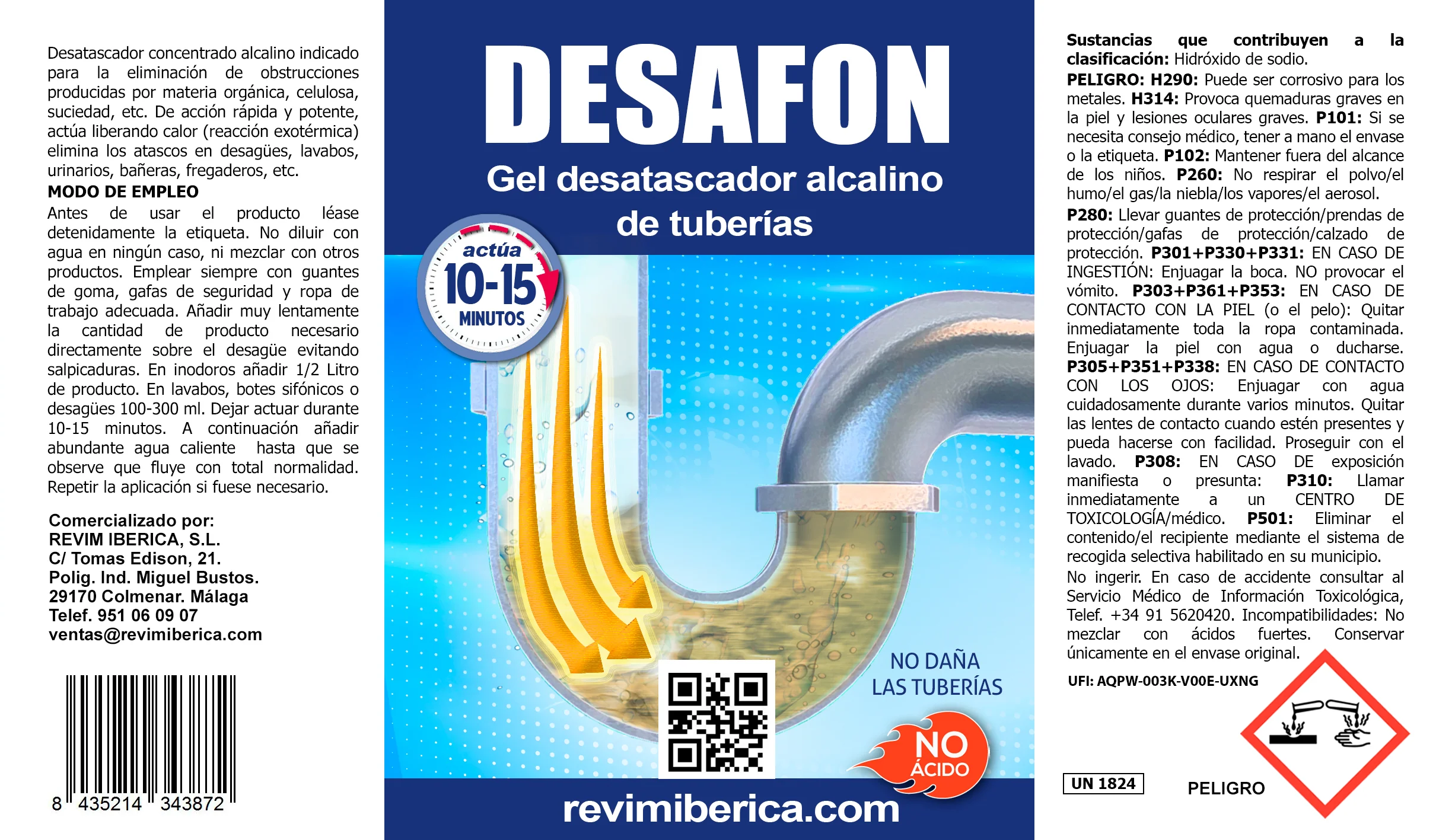 Desatascador concentrado alcalino indicado para la eliminación de obstrucciones producidas por materia orgánica, celulosa, suciedad, etc. De acción rápida y potente actúa liberando calor (reacción exotérmica) elimina los atascos en desagües, lavabos, urinaros, bañeras, fregaderos, etc.