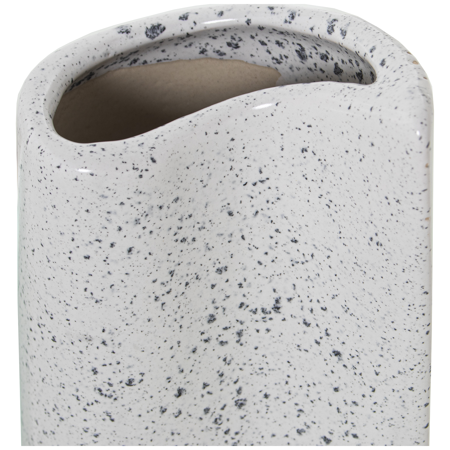 Jarrón de cerámica blanco con detalles dorados y plateados.