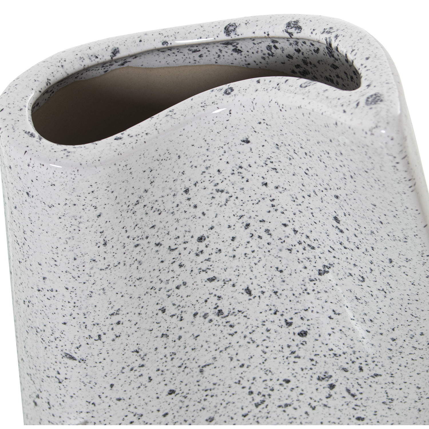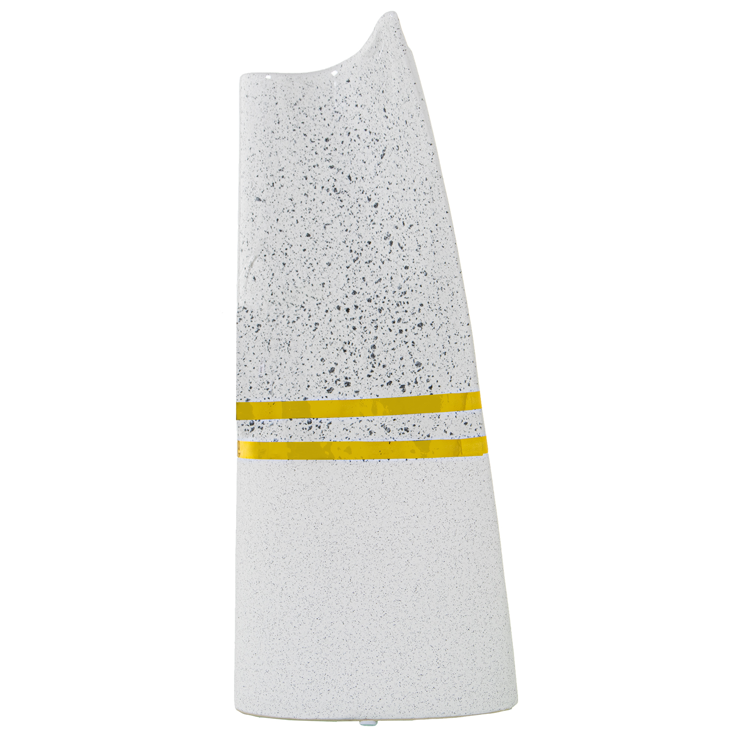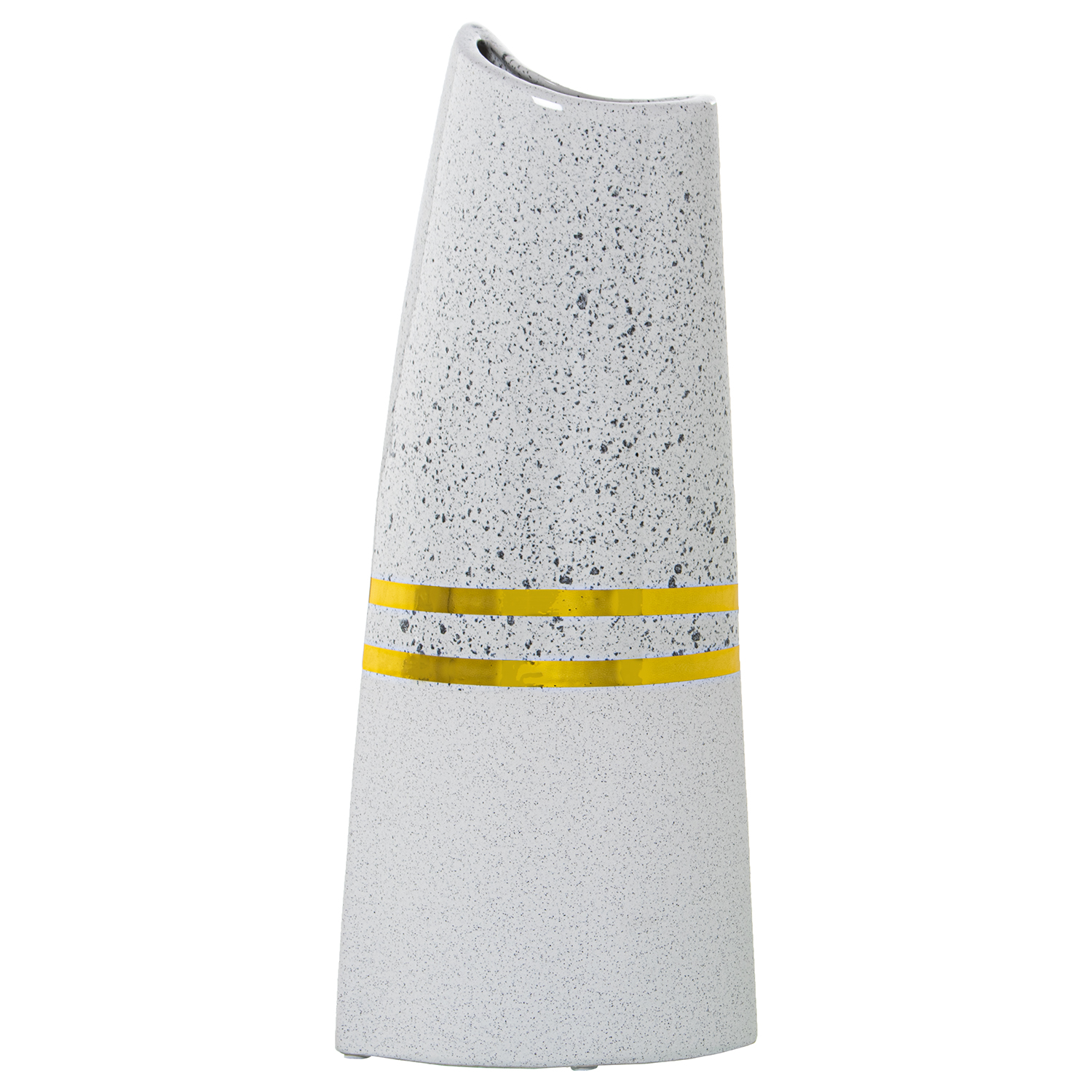 Jarrón de cerámica blanco con detalles dorados y plateados.