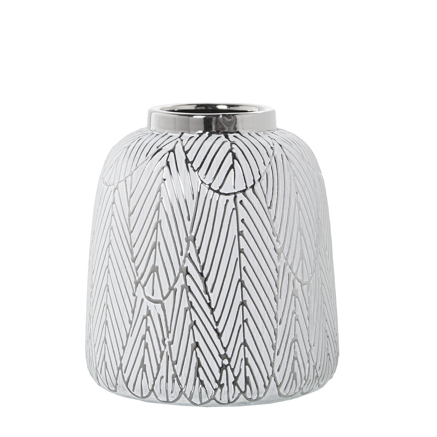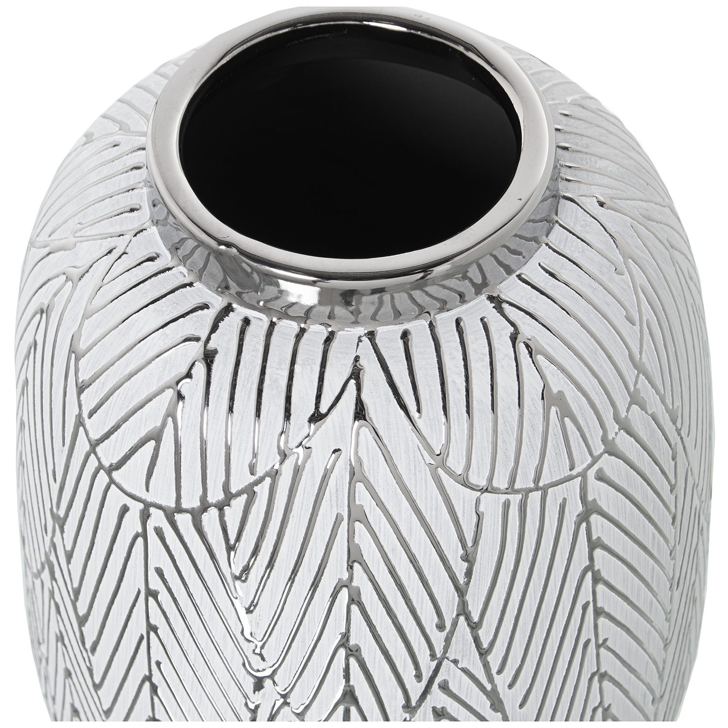 Jarrón de cerámica plateado con detalles de hojas en blanco